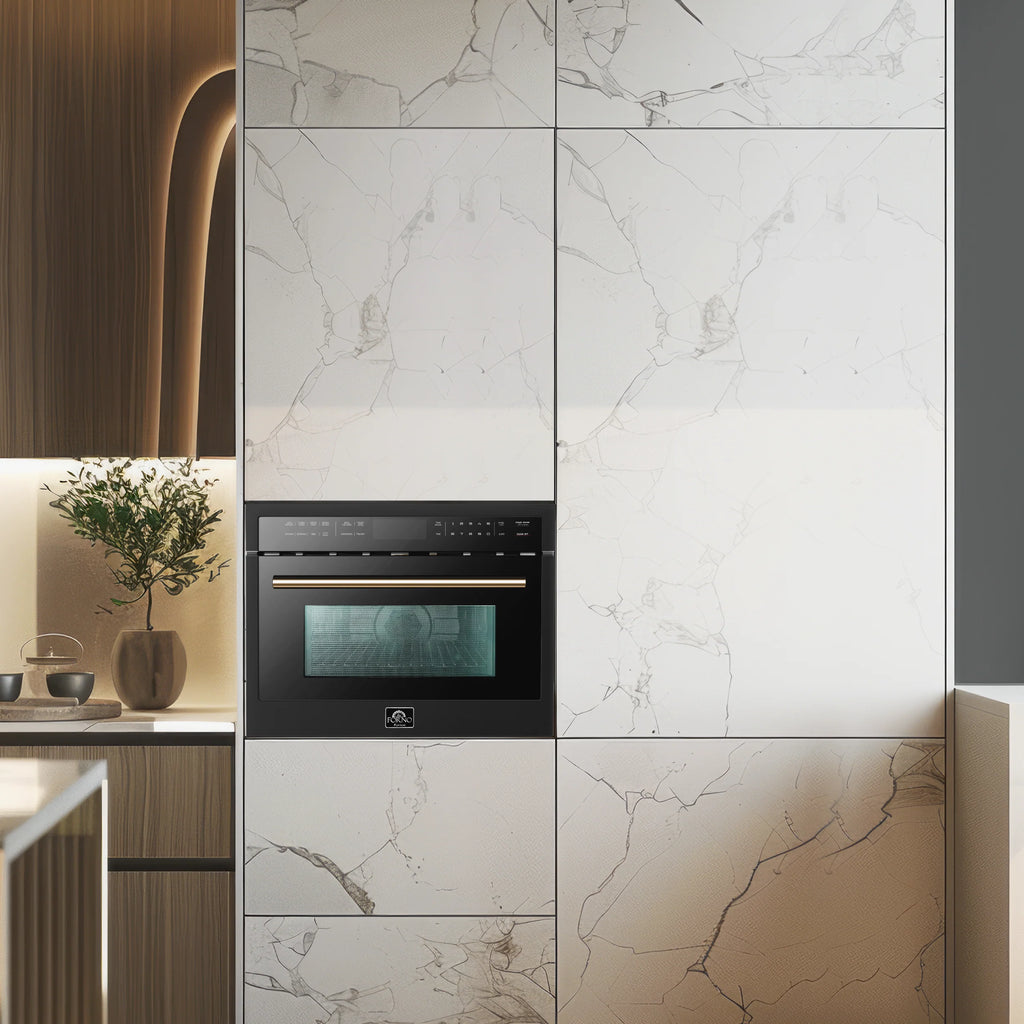 The Forno Oliena 24-Inch 1.6 cu.ft. Microwave & Convection Oven combines style and practicality for any modern kitchen. Its stainless-steel interior ensures easy cleaning, while intuitive controls allow seamless switching between microwave and oven functions. With 1,000 watts of cooking power, you can boil water in just 1 minute and 50 seconds using standard microwave settings. The glass touch controls and LCD display simplify navigation through various microwave modes such as defrost, popcorn, beverage, sensor cooking, and auto menu. In oven mode, enjoy the versatility of true convection at 1,700 watts, along with a broil function of 1,750 watts and a bake element of 600 watts, perfect for cooking individual dishes without needing the main oven. Rapid Preheat mode reduces waiting times, ensuring your meals are ready faster.