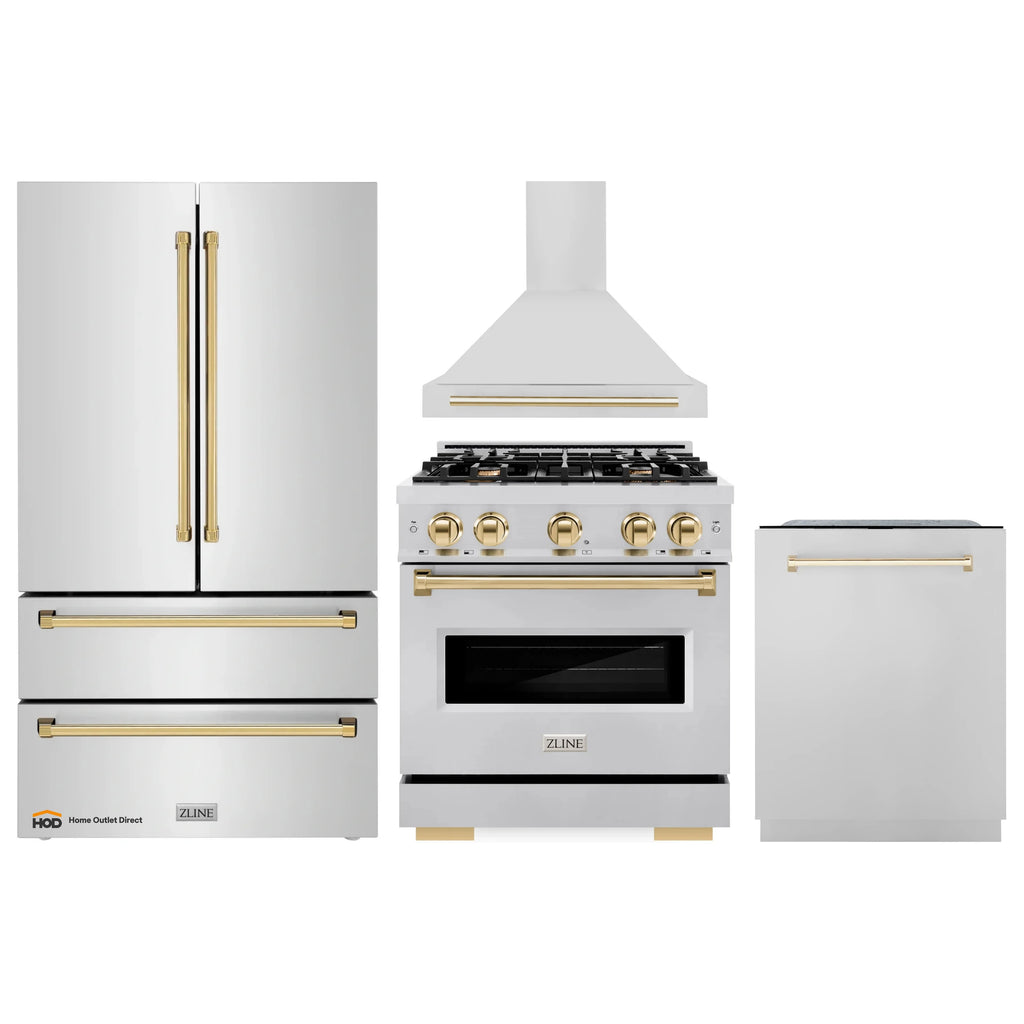 ZLINE 4-Piece Appliance Package - 30-Inch Gas Range, Hood, Refrigerator, and Dishwasher in Stainless Steel with Gold Accents