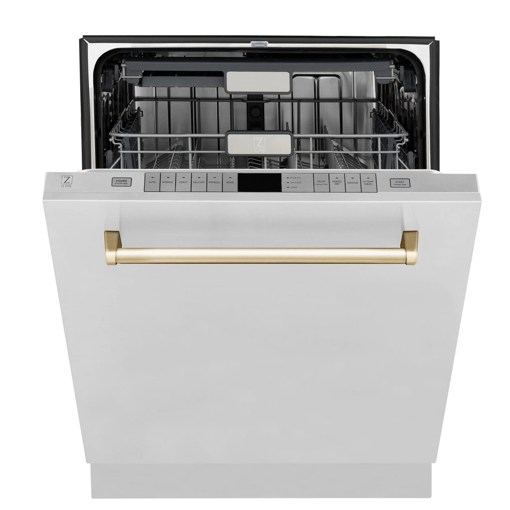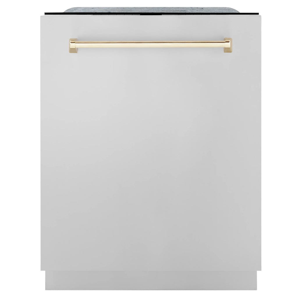 Designed in Lake Tahoe, USA, the ZLINE Autograph Edition 24" 3rd Rack Top Touch Control Tall Tub Dishwasher in Stainless Steel with Gold Handle, 45dBa (DWMTZ-304-24-G) provides a professional culinary experience by pairing unmatched performance with personalized touches.