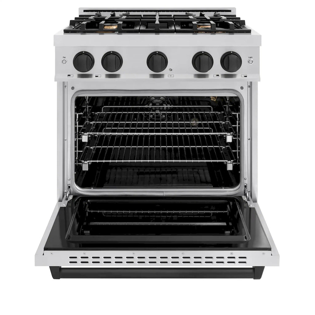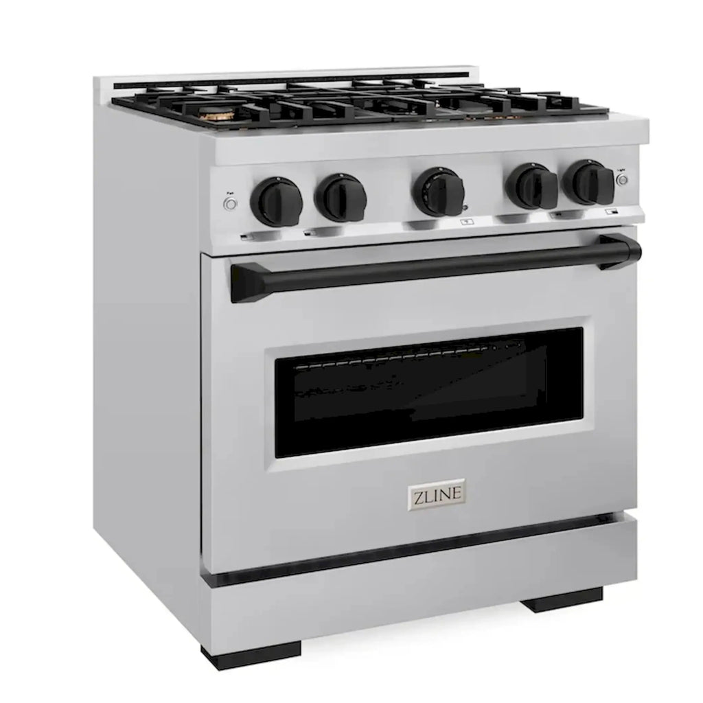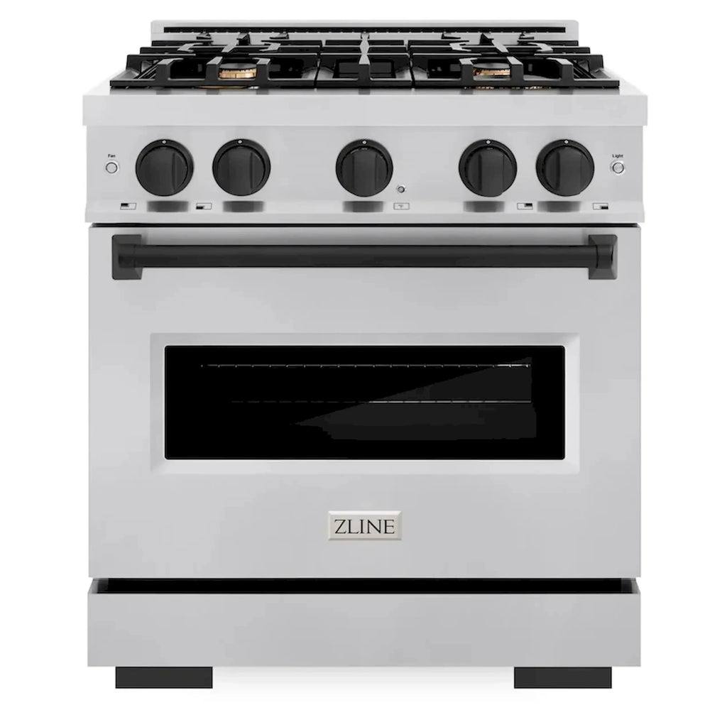Luxury isn’t meant to be desired - it’s meant to be attainable. The ZLINE Autograph Edition 30 in. 4.2 cu. ft. Classic Gas Range with 4 Burner Cooktop and Convection Gas Oven in Stainless Steel and Matte Black Accents (CGRZ-30-MB) combines the elegance of a hand-finished porcelain gas cooktop with 4 Italian-made auto-reignition burners, a gas convection oven with an energy-efficient cooling fan to ensure quiet operation, a Landscape oven door window design, and stunning matte black knobs and handle allowing you to master every meal. With a modern, timeless style and refined functionality, ZLINE Classic Gas Ranges are masterfully crafted to deliver an elevated culinary experience.