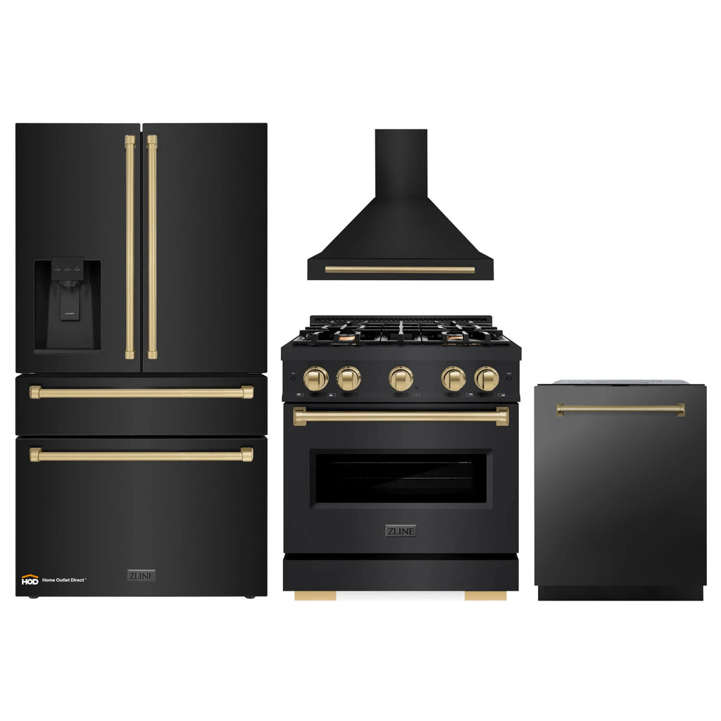 ZLINE 4-Piece Appliance Package - 30-Inch Gas Range, Hood, Refrigerator with Water Dispenser, and Dishwasher in Black Stainless Steel with Champagne Bronze Accents