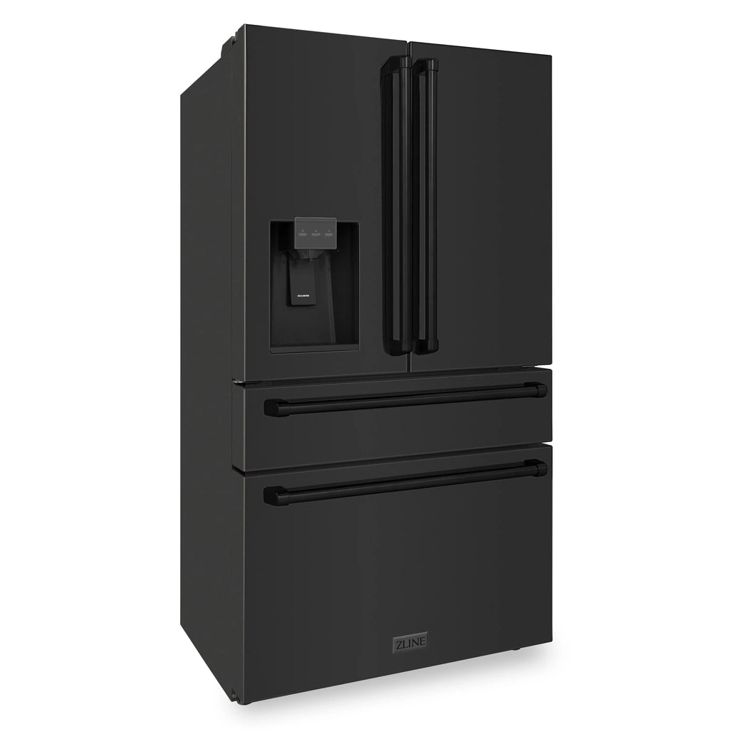 ZLINE 4-Piece Appliance Package - 36-Inch Dual Fuel Range, Hood, Refrigerator with Water Dispenser, and Dishwasher in Black Stainless Steel