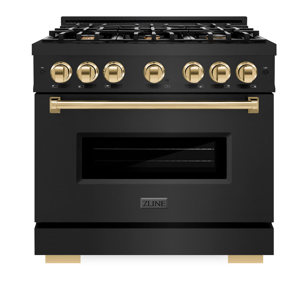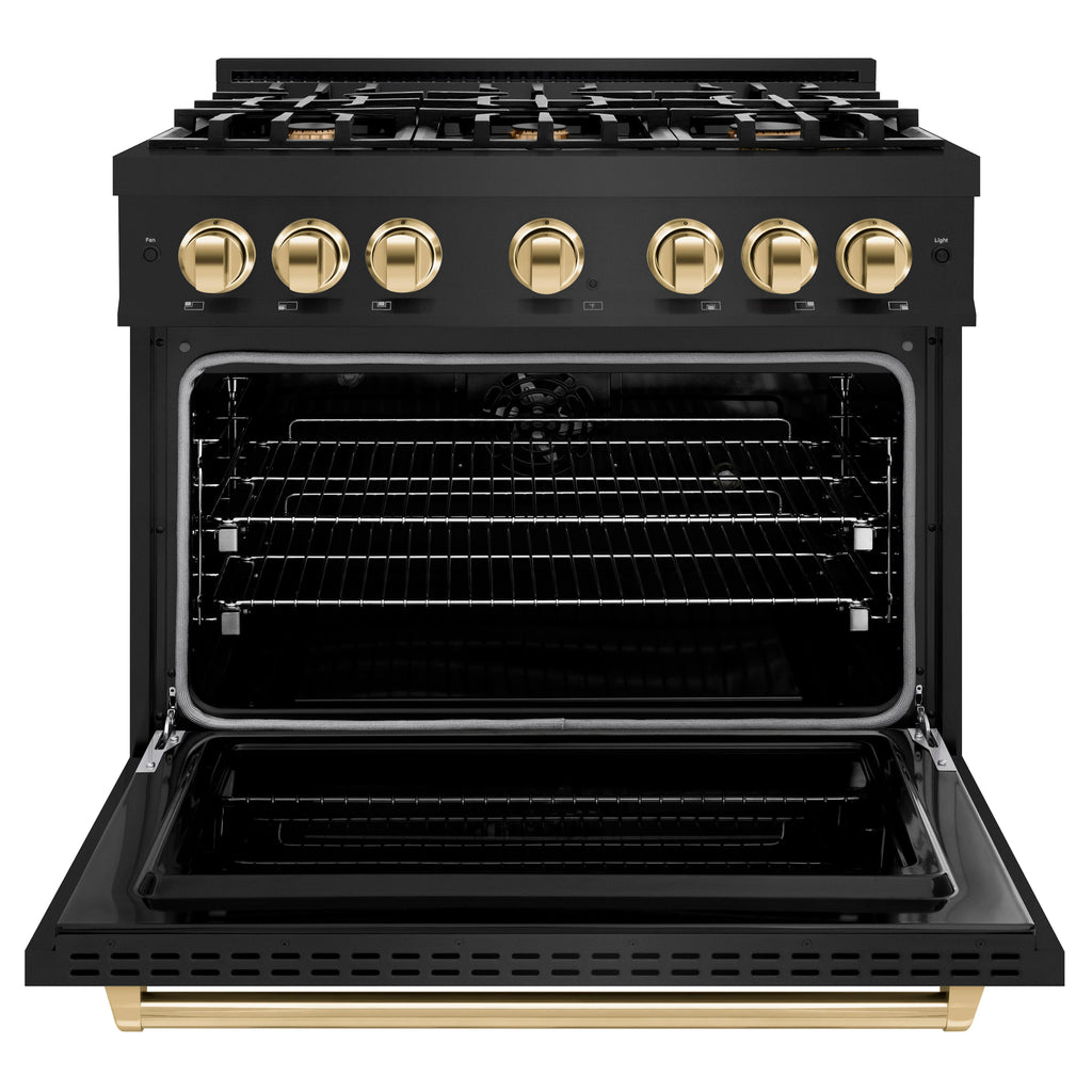 Luxury isn’t meant to be desired - it’s meant to be attainable. The ZLINE Autograph Edition 36 in. 5.2 cu. ft. Classic Dual Fuel Range with 6 Burner Gas Cooktop and Electric Convection Oven in Black Stainless Steel with Polished Gold Accents (CDRBZ-36-G) combines the elegance of a hand-finished porcelain gas cooktop with 6 Italian-made auto-reignition burners, an electric convection oven with an energy-efficient cooling fan to ensure quiet operation, a Landscape oven door window design, and stunning polished gold knobs and handle allowing you to master every meal. With a modern, timeless style and refined functionality, ZLINE Classic Dual Fuel Ranges are masterfully crafted to deliver an elevated culinary experience.