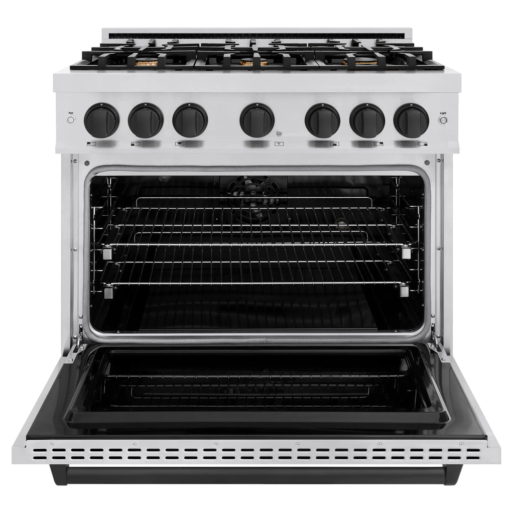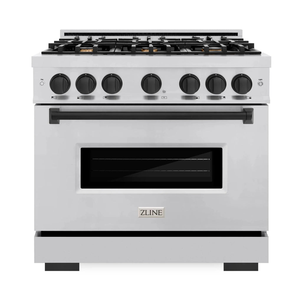 Luxury isn’t meant to be desired - it’s meant to be attainable. The ZLINE Autograph Edition 36 in. 5.2 cu. ft. Classic Dual Fuel Range with 6 Burner Gas Cooktop and Electric Convection Oven in Stainless Steel with Matte Black Accents (CDRZ-36-MB) combines the elegance of a hand-finished porcelain gas cooktop with 6 Italian-made auto-reignition burners, an electric convection oven with an energy-efficient cooling fan to ensure quiet operation, a Landscape oven door window design, and stunning matte black knobs and handle allowing you to master every meal. With a modern, timeless style and refined functionality, ZLINE Classic Dual Fuel Ranges are masterfully crafted to deliver an elevated culinary experience.
