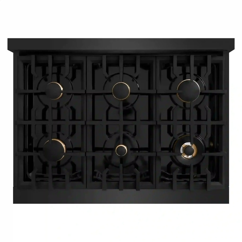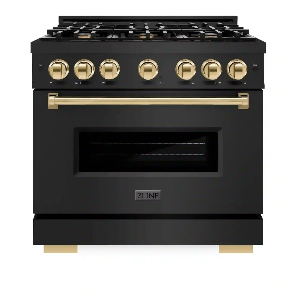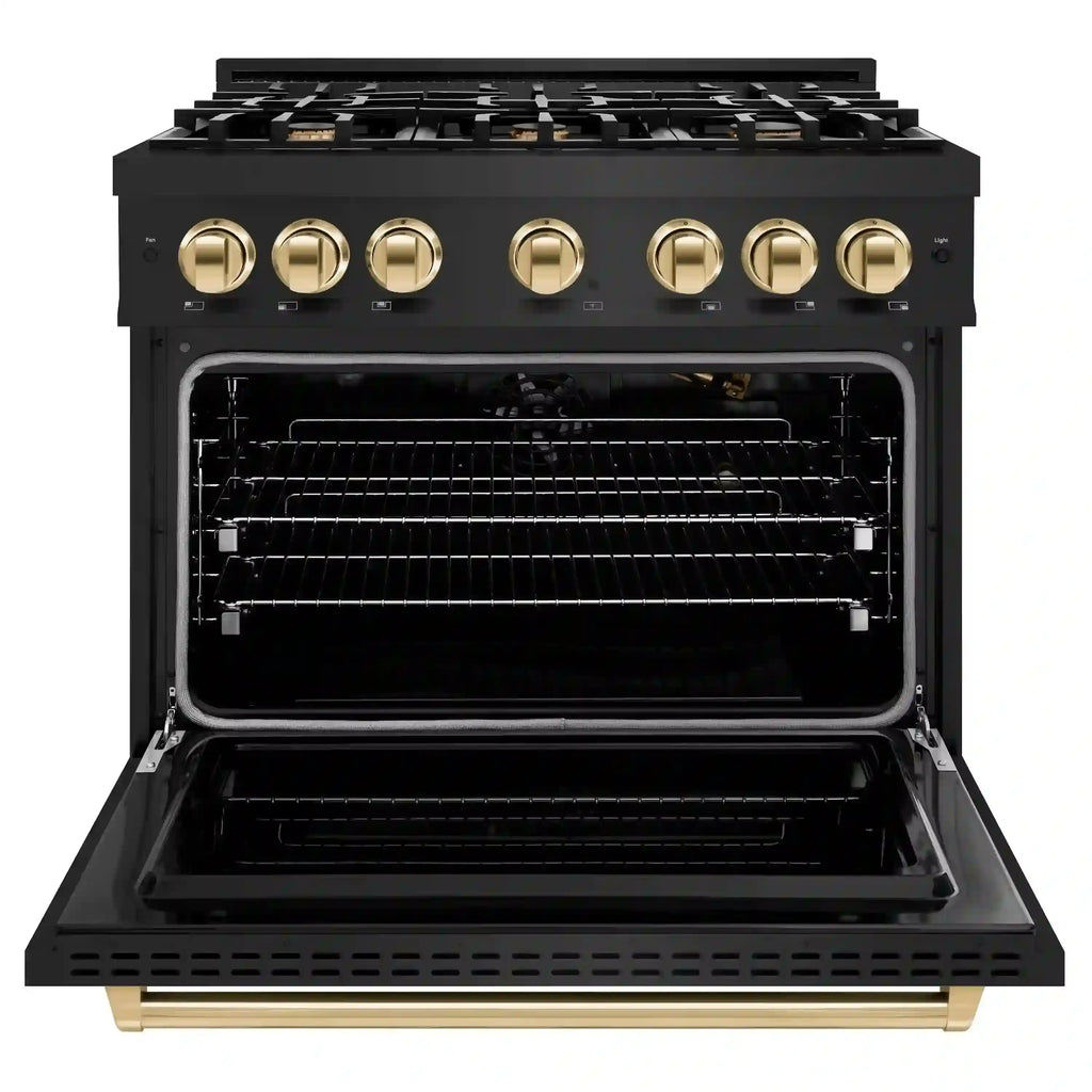 Luxury isn’t meant to be desired - it’s meant to be attainable. The ZLINE Autograph Edition 36 in. 5.2 cu. ft. Classic Gas Range with 6 Burner Cooktop and Convection Gas Oven in Black Stainless Steel and Polished Gold Accents (CGRBZ-36-G) combines the elegance of a hand-finished porcelain gas cooktop with 6 Italian-made auto-reignition burners, a gas convection oven with an energy-efficient cooling fan to ensure quiet operation, a Landscape oven door window design, and stunning polished gold knobs and handle allowing you to master every meal. With a modern, timeless style and refined functionality, ZLINE Classic Gas Ranges are masterfully crafted to deliver an elevated culinary experience.