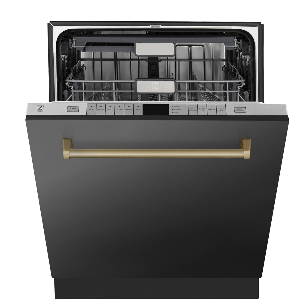 Designed in Lake Tahoe, USA, the ZLINE Autograph Edition 24" 3rd Rack Top Touch Control Tall Tub Dishwasher in Black Stainless Steel with Champagne Bronze Handle, 45dBa (DWMTZ-BS-24-CB) provides a professional culinary experience by pairing unmatched performance with personalized touches.
