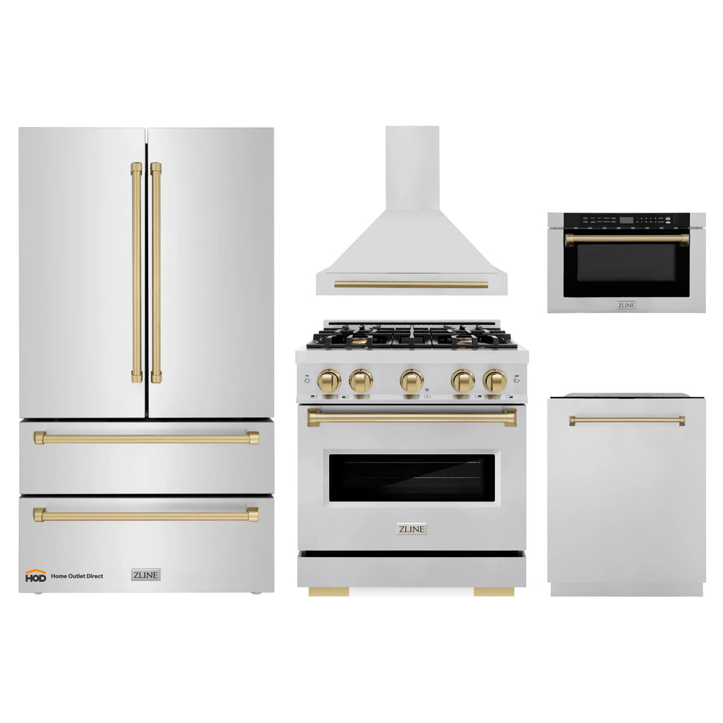 ZLINE 5-Piece Appliance Package - 30-Inch Gas Range, Hood, Refrigerator, Dishwasher, and Microwave Drawer in Stainless Steel with Champagne Bronze Accents