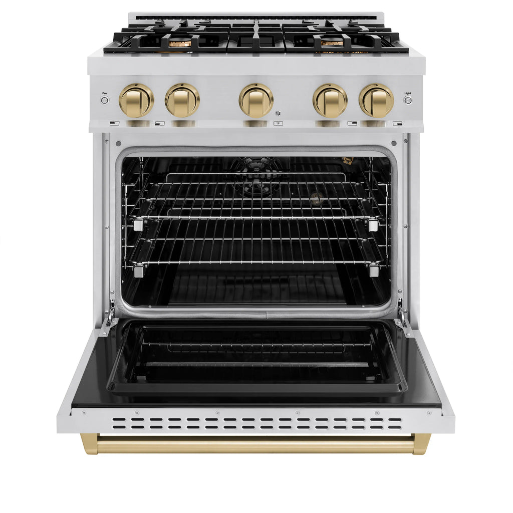 Luxury isn’t meant to be desired - it’s meant to be attainable. The ZLINE Autograph Edition 30 in. 4.2 cu. ft. Classic Gas Range with 4 Burner Cooktop and Convection Gas Oven in Stainless Steel and Champagne Bronze Accents (CGRZ-30-CB) combines the elegance of a hand-finished porcelain gas cooktop with 4 Italian-made auto-reignition burners, a gas convection oven with an energy-efficient cooling fan to ensure quiet operation, a Landscape oven door window design, and stunning champagne bronze knobs and handle allowing you to master every meal. With a modern, timeless style and refined functionality, ZLINE Classic Gas Ranges are masterfully crafted to deliver an elevated culinary experience.