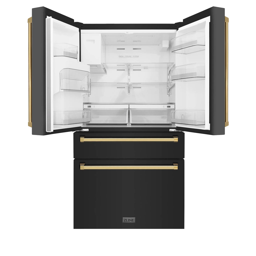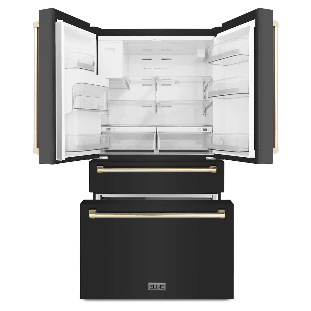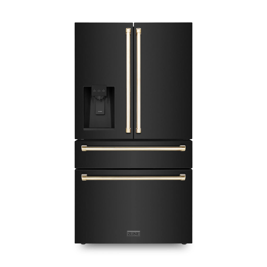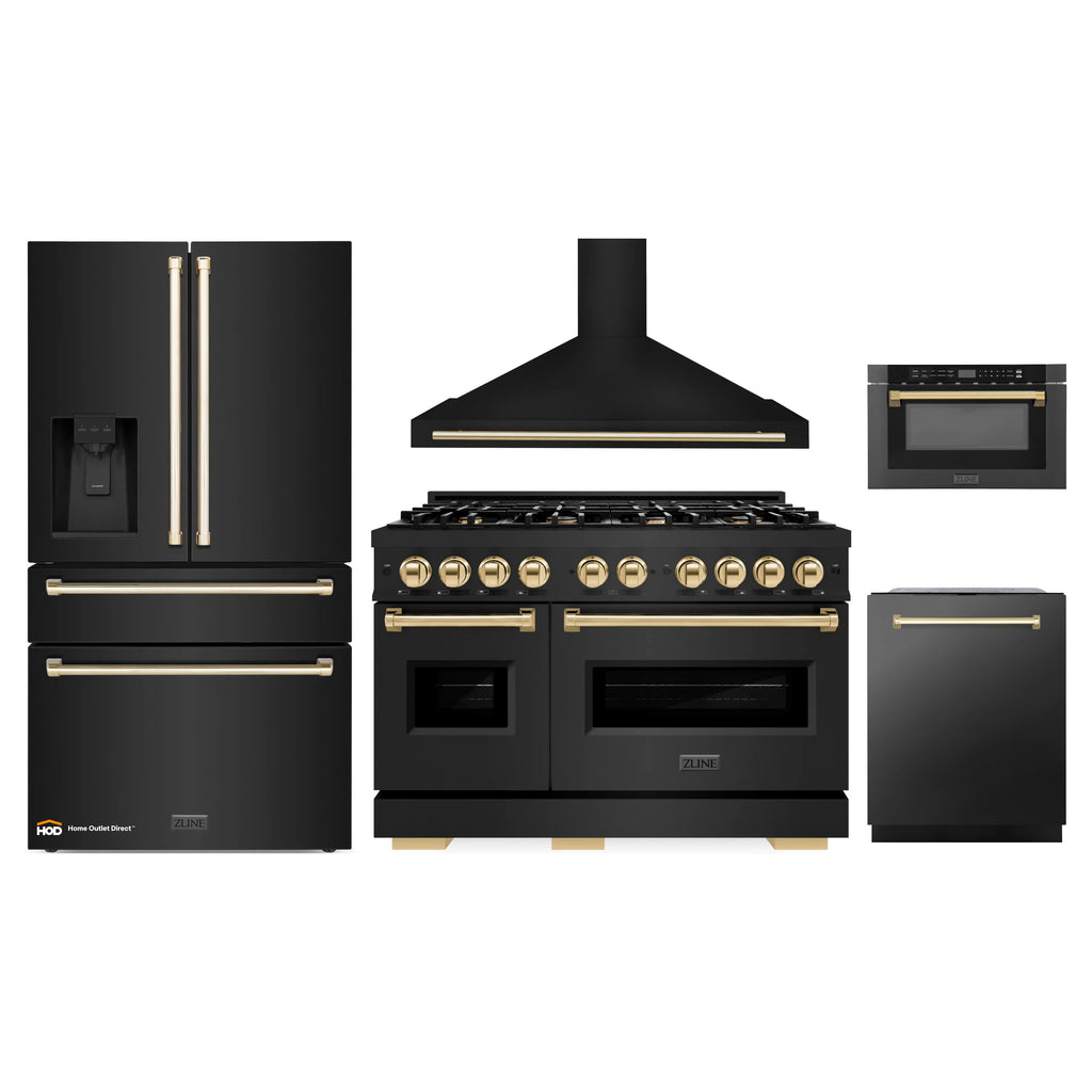 ZLINE 5-Piece Appliance Package - 48-Inch Gas Range, Hood, Refrigerator with Water Dispenser, Dishwasher, and Microwave Drawer in Black Stainless Steel with Gold Accents