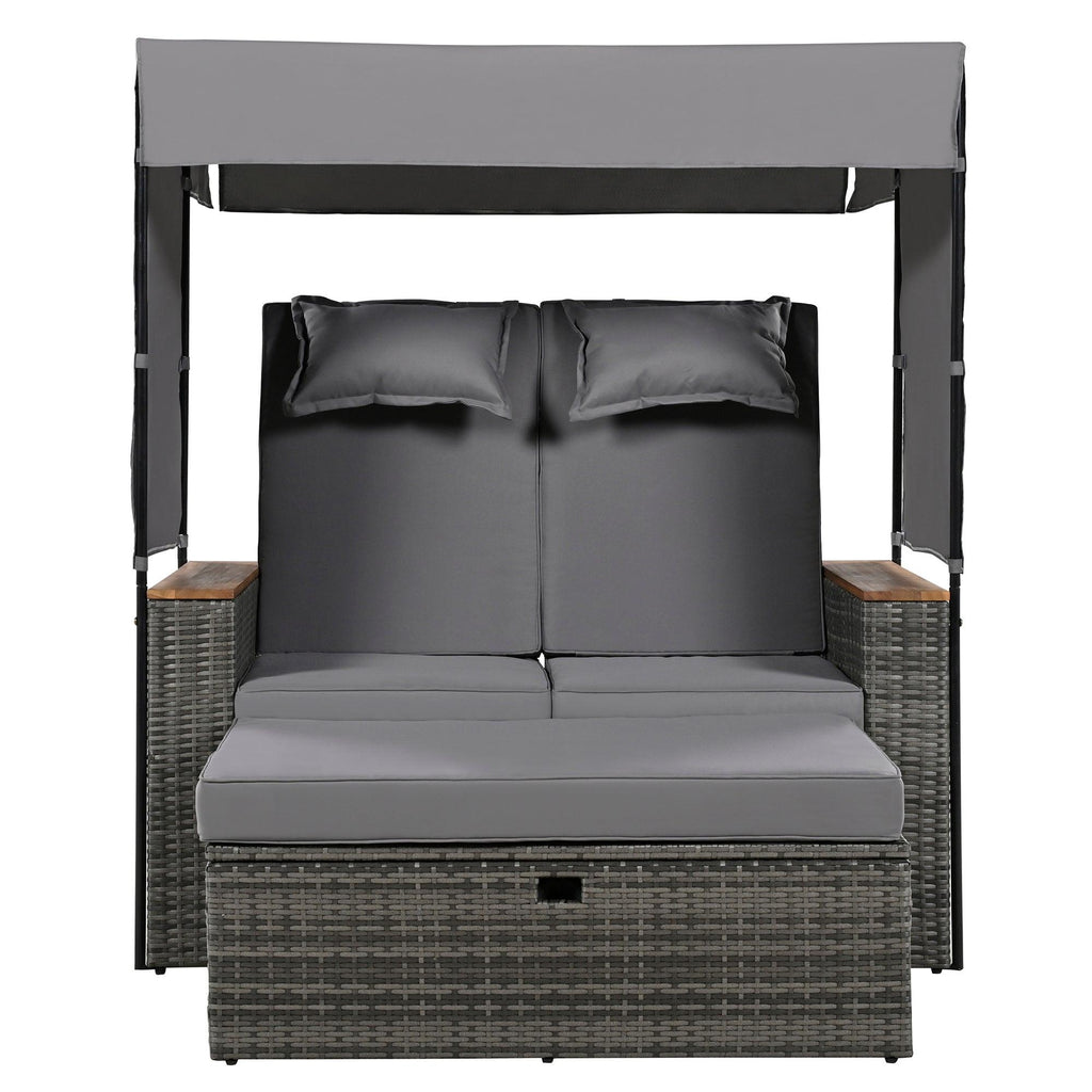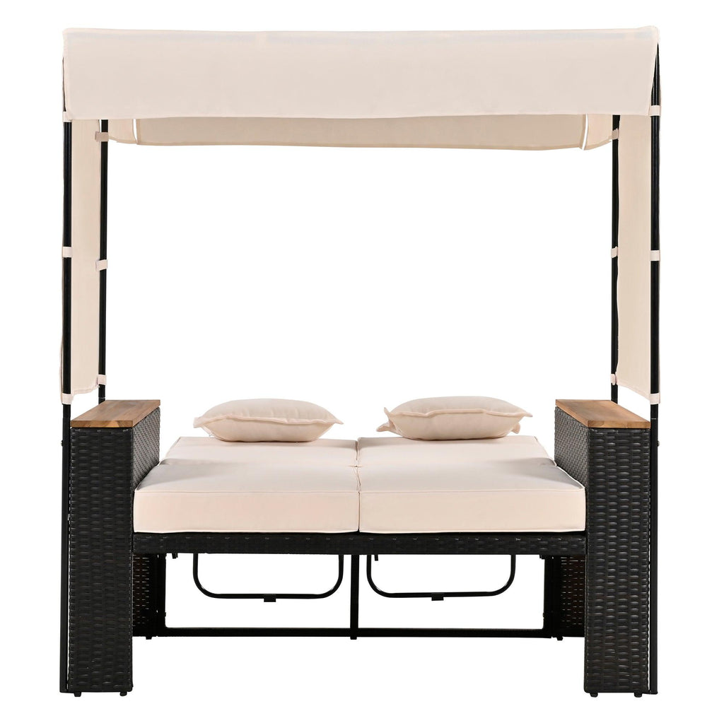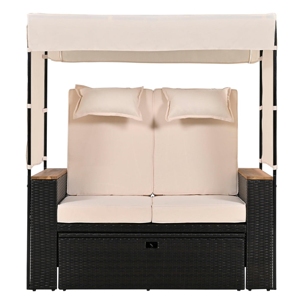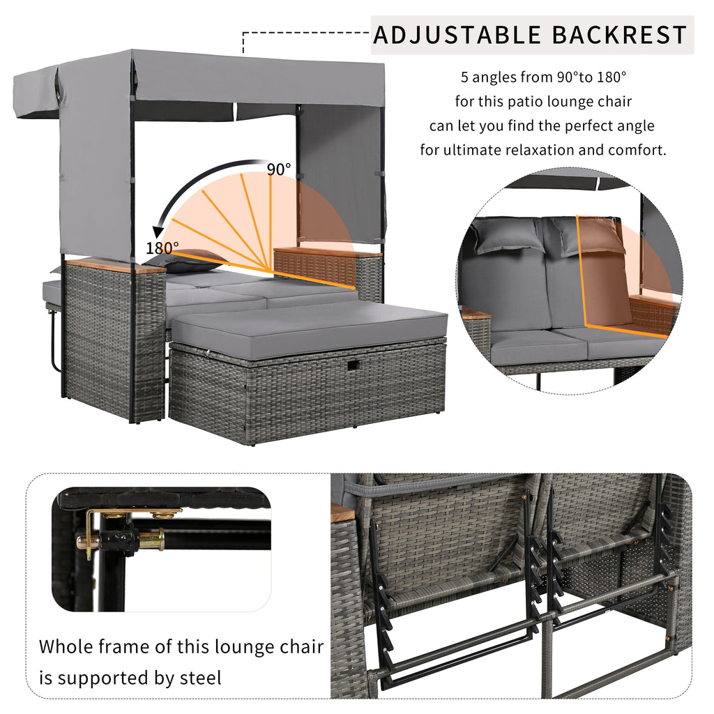 Upgrade your outdoor space with this versatile rattan daybed set, featuring a 5-position adjustable loveseat and a matching bench lounge. Complete with a sturdy roof and plush cushions, it's perfect for poolside relaxation, backyard lounging, or garden naps. Durable, stylish, and designed for ultimate comfort.