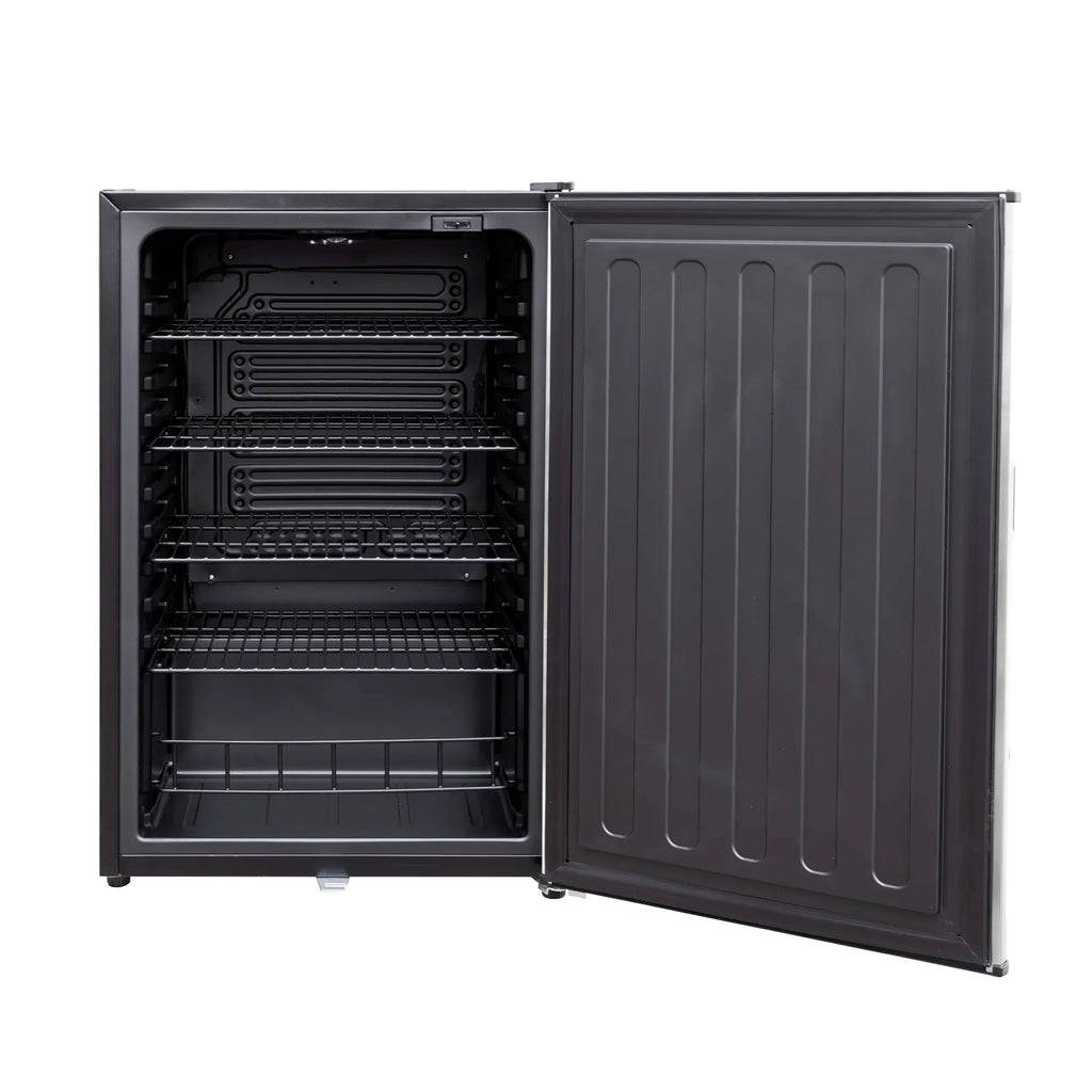 The 22" Compact Refrigerator Series offers 4.2 cubic feet of storage, reversible #304 stainless steel doors, automatic interior lighting, and a sleek black interior. Build them into an island or use them inside—these refrigerators will add a whole new level of convenience to your setup.