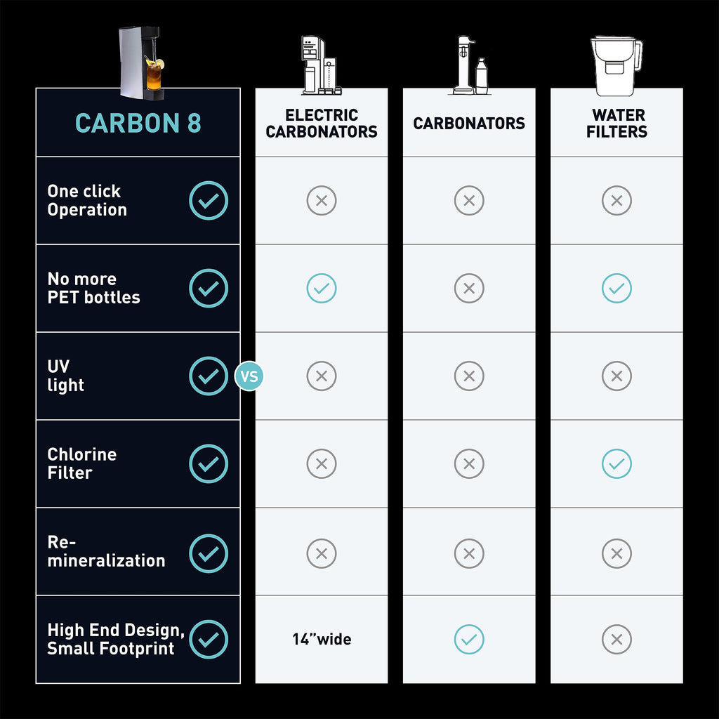 • ALWAYS FRESH WATER, NO LEFTOVERS: Carbon8's single-serve option prevents carbonated water from going flat. The fast carbonation process makes it easy to refill your glass multiple times, putting an end to the frustration of half-full bottles losing their fizz after just a couple of uses.