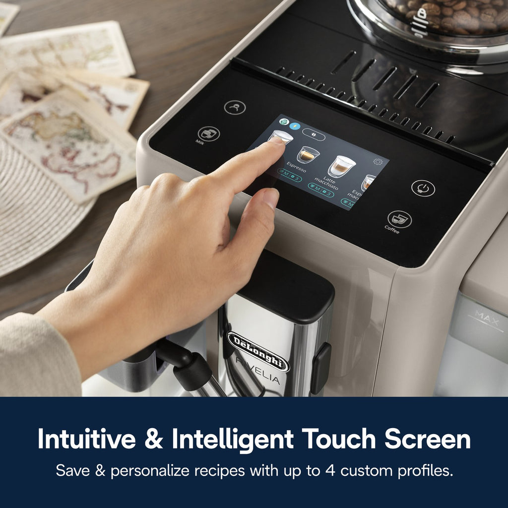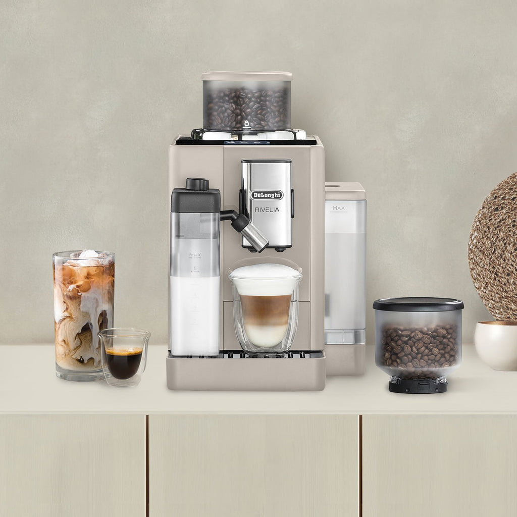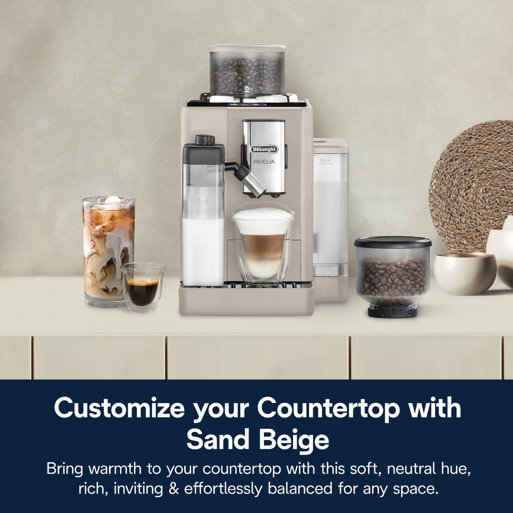 Your favorite drinks are just a touch away—grind, dose, brew and froth in style with the Rivelia fully automatic espresso machine. This compact, award-winning design invites you to easily and intuitively switch up your daily coffee routine with ease and customization—from instantly swapping between bean types, to tailoring your brew to your bean, to learning and storing your individual preferences for you and three other users for the perfect drink, to custom colors to bring out your personality in the kitchen. It all starts with the innovative Bean Switch System: interchangeable bean hoppers that enable you to explore worlds of coffee flavor by swapping one fresh bean type for another without missing a beat. Go from a robust dark roast in the morning to a light decaf latte or rich espresso martini later in the day. Then Rivelia’s Bean Adapt Technology becomes your personal coffee expert—helping you set and save each unique bean’s ideal grind, dose and temperature to ensure the perfect extraction every time. Guesswork: gone. Options: infinite. Rivelia’s fully automatic LatteCrema Hot System takes all the fuss out of frothing. There’s no messy steam wand or complicated manual control. With just the touch of a button, you can easily froth milk or plant-based alternatives directly into your cup to create steamy, creamy lattes, cappuccinos and other specialty drinks with ease. And with four distinct user profiles, smart menus that update throughout the day based on your coffee routine and a 3.5-inch color touch display featuring an expansive menu of hot and cold recipes, coffeemaking at home is transformed from a daily to-do to a delightful moment that can match any mood, with any bean, any drink, at any time of day. With the Rivelia and its modern minimalist design that’s more décor than appliance, the power to switch and personalize your coffee experience at home is at your fingertips.
