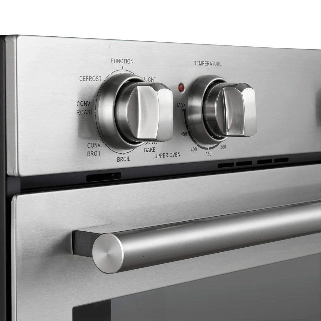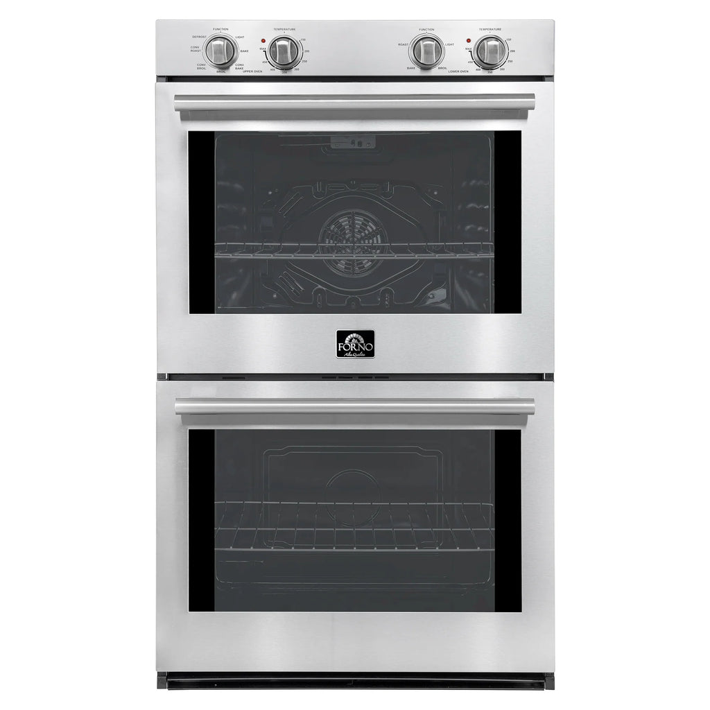The Forno Vomero 30" Double Wall Oven is the ideal choice for any kitchen, offering versatility, performance, and style. With 6 cooking functions—Bake, Conv Bake, Broil, Conv Broil, Conv Roast, and Roast—it can handle everything from casual meals to elaborate feasts. Equipped with a powerful 2000W broiler, 1500W bake element, and 50W convection fan in each oven, this oven ensures fast and even cooking. With a total capacity of 10 cu.ft. and ample space for baking sheets up to 23 x 16 inches, it meets the needs of any chef. The mechanical knob control panel is user-friendly, and two halogen lights in each oven provide excellent visibility. Featuring a sleek stainless steel finish, triple-layer glass for safety, and an easy-to-clean interior, this oven is built for both style and practicality. Includes 3 chrome-plated racks and an adjustable shelf. Backed by a 2-year in-house warranty. Lower the cost of living with Forno.