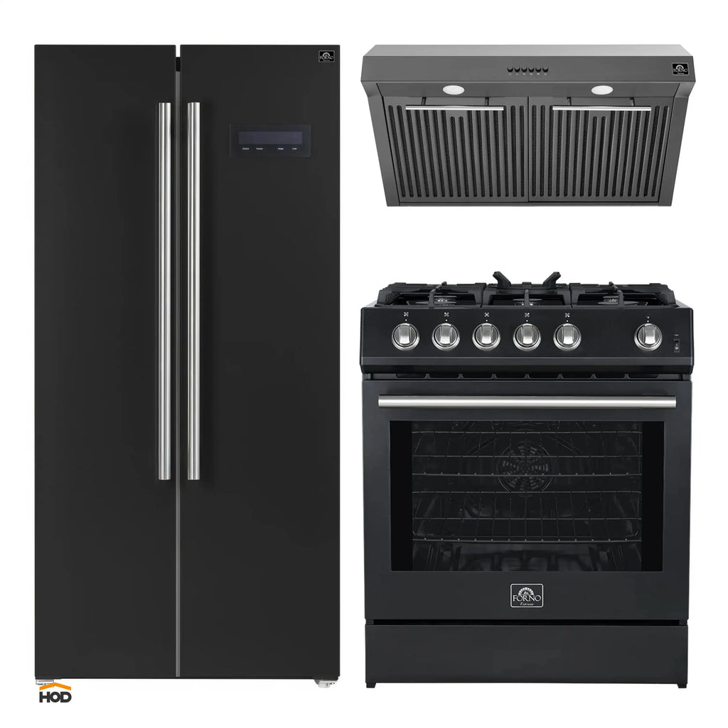 The Forno Leonardo Espresso 30 Inch 5.0 cu.ft. black gas range seamlessly blends style and functionality with the precision of gas power. Its high-performance range top delivers an impressive total output of 39,500 BTU, complemented by continuous cast iron grates that ensure unmatched stability and mobility for your cookware. Thanks to the deep recessed cavity of the black enamel range top, cleaning up spills is effortless. In the 5 cu.ft. convection oven, a combined broil and bake power of 22,500 BTU ensures precision cooking. With two adjustable rack heights and a robust convection fan, achieve consistent heat distribution for uniform cooking across multiple levels, meeting all your culinary needs with perfection.