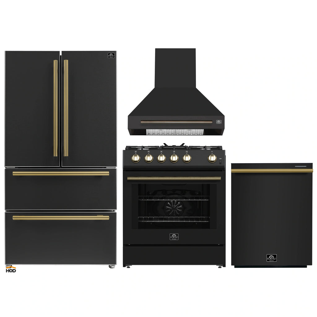 The Forno Leonardo Espresso 30 Inch 5.0 cu.ft. black gas range seamlessly blends style and functionality with the precision of gas power. Its high-performance range top delivers an impressive total output of 39,500 BTU, complemented by continuous cast iron grates that ensure unmatched stability and mobility for your cookware. Thanks to the deep recessed cavity of the black enamel range top, cleaning up spills is effortless. In the 5 cu.ft. convection oven, a combined broil and bake power of 22,500 BTU ensures precision cooking. With two adjustable rack heights and a robust convection fan, achieve consistent heat distribution for uniform cooking across multiple levels, meeting all your culinary needs with perfection.
