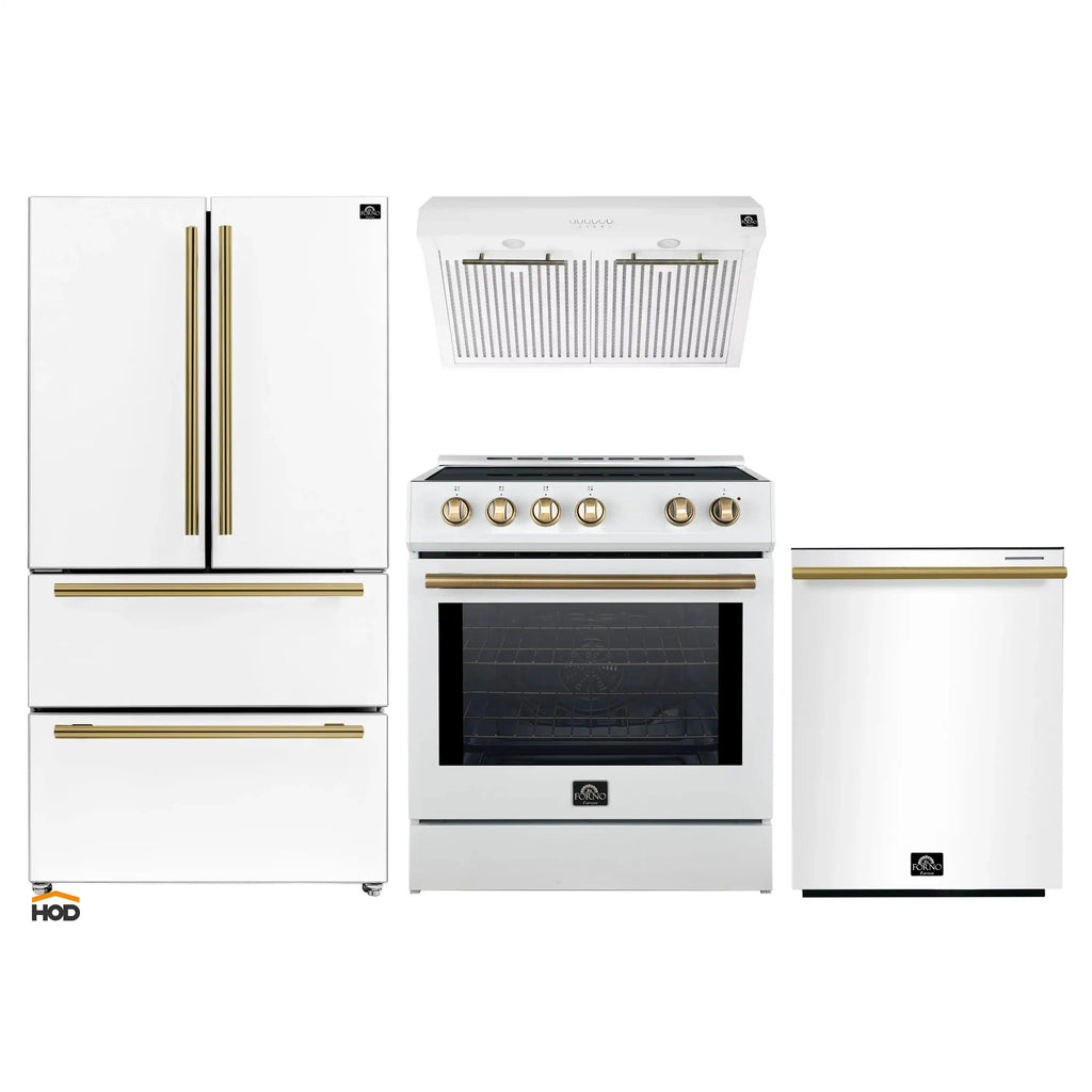 The FORNO Leonardo Espresso 30-Inch White Induction Range elevates your cooking experience with a perfect blend of style, functionality, and reliability. Featuring a elegant white finish, this unit includes knobs and handles in both antique brass and stainless steel, allowing you to customize your kitchen decor. Experience the efficiency of our powerful 8,100-watt induction elements, designed to deliver optimal cooking performance. The 5 cu.ft. convection oven boasts a high-performance convection fan and a broil and bake output of 3,500 watts. With two oven racks at your disposal, explore endless culinary possibilities with ease. The speckled blue enamel interior guarantees consistent heat absorption and retention, ensuring every dish is cooked to perfection. Effortless operation is ensured by friction-resistant hinges, while the hidden bake element prevents spills, simplifying maintenance. Skip the high price tags without sacrificing quality and performance. Lower the cost of living with Forno.