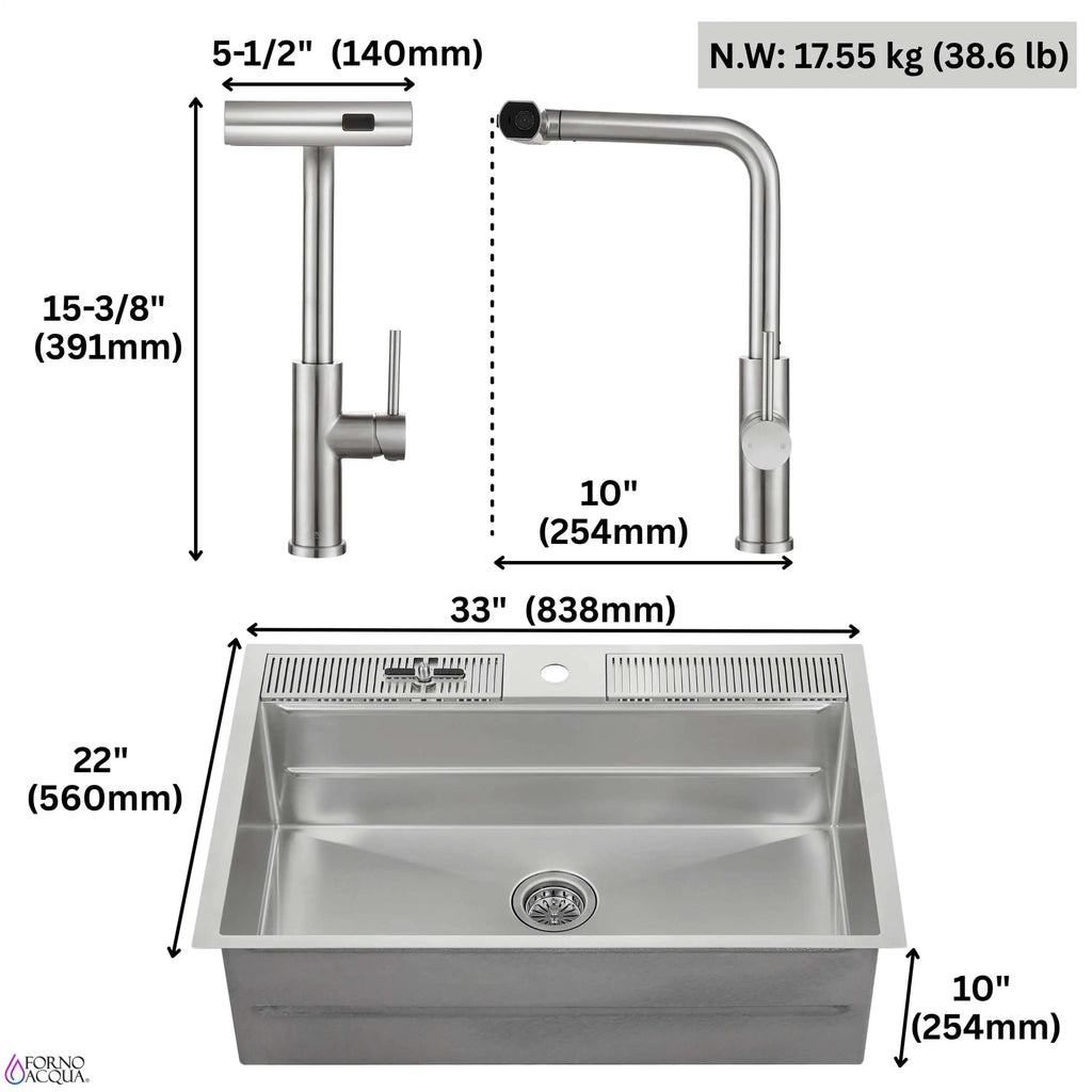Reimagine your kitchen with the MultiSINK Pro T-Faucet Workstation a sculpted centerpiece designed for beauty, versatility, and performance. Its 3-level layout and 10" deep basin create seamless zones for prep, rinse, and cleanup. The stainless steel T waterfall faucet offers three spray modes for pro-level control, while the integrated glass washer keeps drinkware spotless. A dual-function bamboo cutting board, stainless steel colander, and four roll-up grids adapt to your workflow, while two removable drying grilles add utility to the deck without clutter. With dual-mount flexibility, cUPC certification, and precision-crafted details, MultiSINK brings timeless design to the heart of your kitchen.