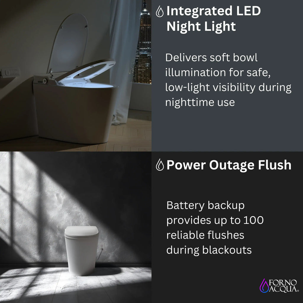 FORNO ACQUA Smart Toilet – Smart Performance, Streamlined Design. Discover the perfect balance of innovation and simplicity with the FORNO ACQUA Smart Toilet, a sleek tankless skirted toilet designed for budget-conscious homeowners who still want smart functionality. Ideal for powder rooms, guest bathrooms, and minimalist spaces. Certified to MaP’s highest performance standards, the Auto Dual Flush system delivers powerful, clog-free performance. Walk away sensors and Foot sensor enables total touchless flushing. Soft-close seat for quiet, gentle operation. Built-in night light for safe, convenient nighttime use. Sleek tankless, skirted design for easy cleaning and a modern look. Enjoy smart performance without the extras. The FORNO ACQUA Smart Toilet delivers a cleaner, more comfortable bathroom experience—without a bidet, heated seat, or auto-lid. Essential features. Elegant design. FORNO ACQUA simplicity.