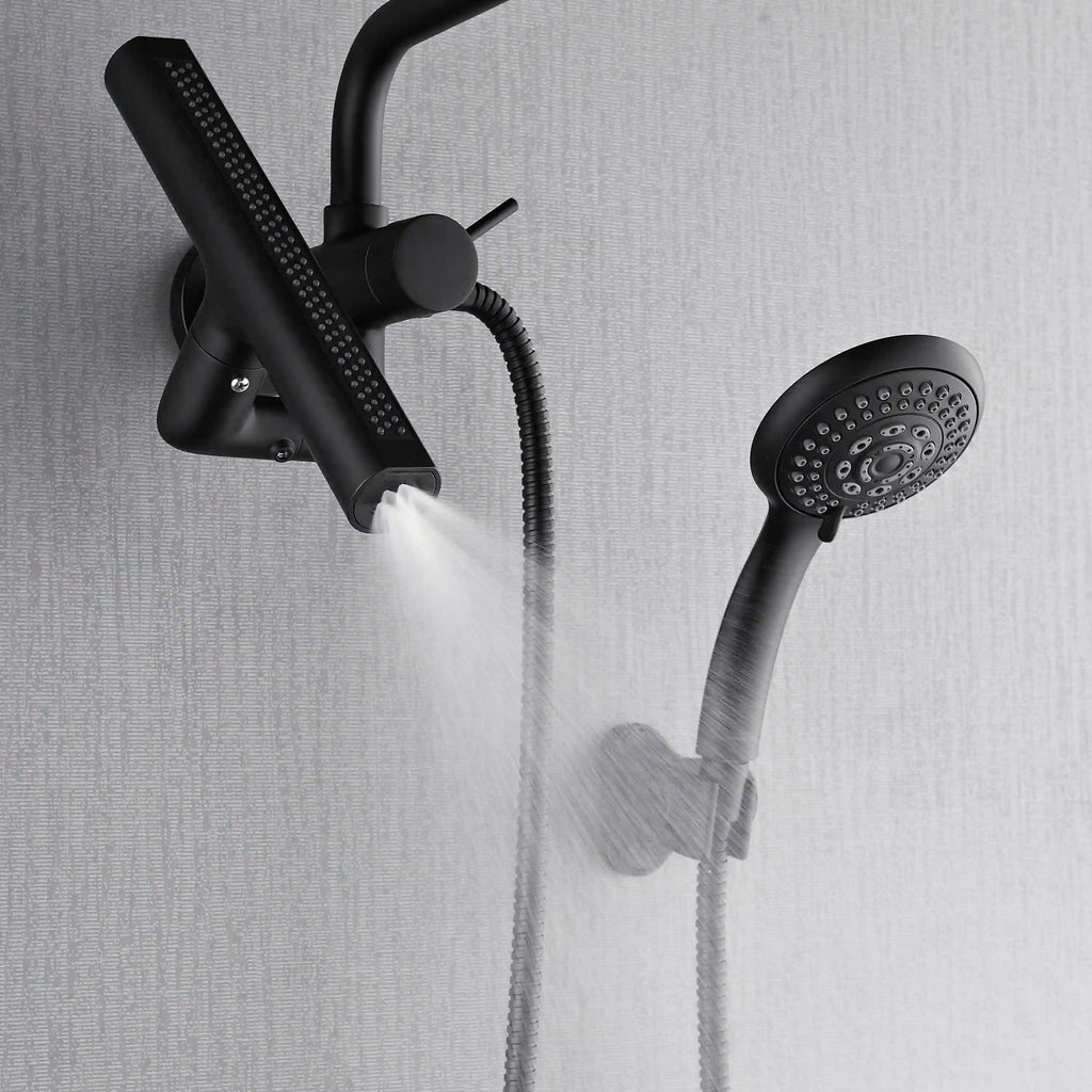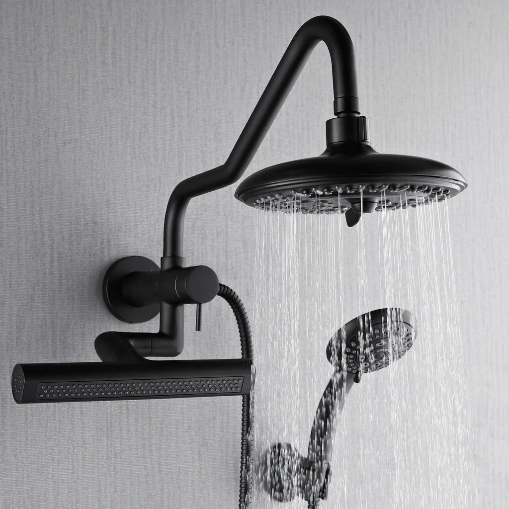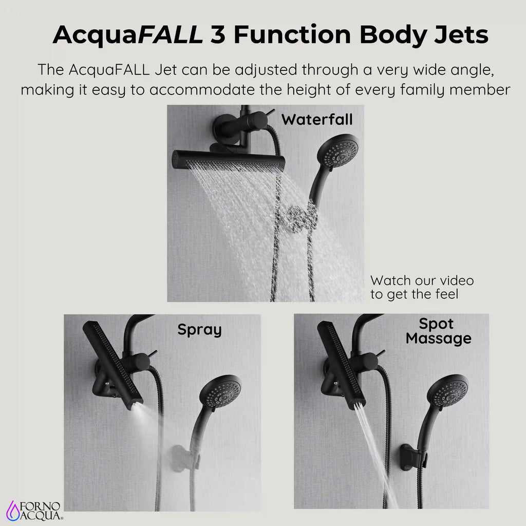 Transform even the smallest bathroom into a spa retreat with the FORNO ACQUA Mini AcquaSPA Shower System. Perfect for apartments, guest baths, or tight spaces, this compact 3-in-1 system includes a patented 6-function rain shower head, a 5-function ergonomic handheld, and the revolutionary 10-1/2 in. AcquaFALL Waterfall Jet for wide or targeted relief. The directional AcquaFALL jet easily suits users of all heights, delivering personalized hydrotherapy for daily relaxation. Designed for quick DIY wall-mounted installation, it blends effortlessly into any layout. Finished in sleek matte black, the Mini AcquaSPA System brings high-performance showering and contemporary design together. Luxury can fit any space.