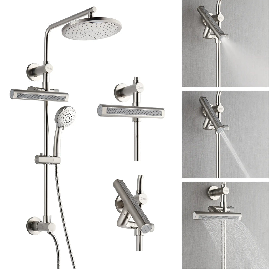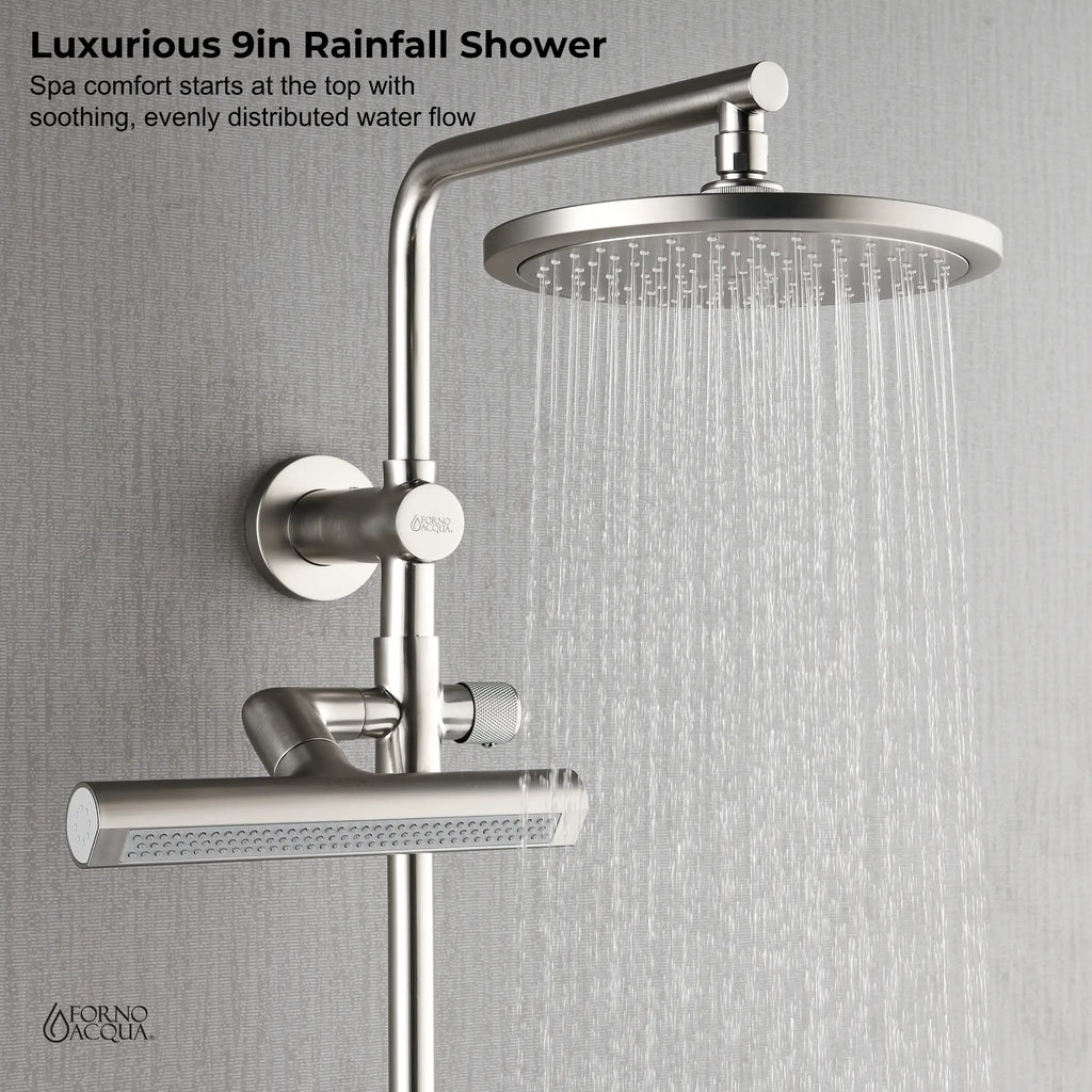 Elevate your shower routine with the FORNO ACQUA AcquaSPA Shower Column, where Italian-inspired design meets innovation for a true spa experience at home. Relax beneath the oversized 9 inch. rain shower head, delivering full-body coverage with a gentle, soothing flow. The revolutionary AcquaFALL Waterfall Jet features a wide 10-1/2 in. outlet and adjustable angle, offering calming relief for shoulders, neck, and tension points. A 5-function ergonomic handheld shower slides smoothly along the integrated adjustable bar, providing flexible comfort for every family member. Designed for easy DIY installation with standard U.S. plumbing, this wall-mounted system blends modern style with lasting performance. Make every shower a moment of restoration. FORNO ACQUA AcquaSPA, luxury, functionality, and wellness in perfect balance.