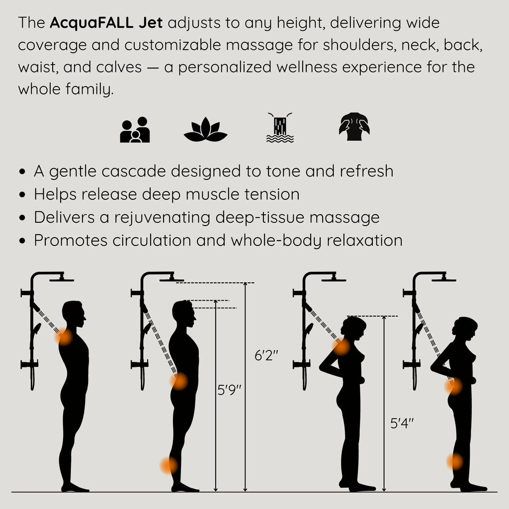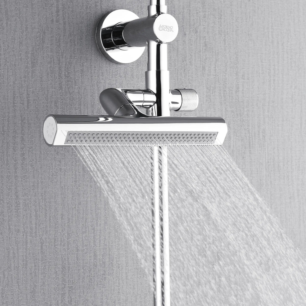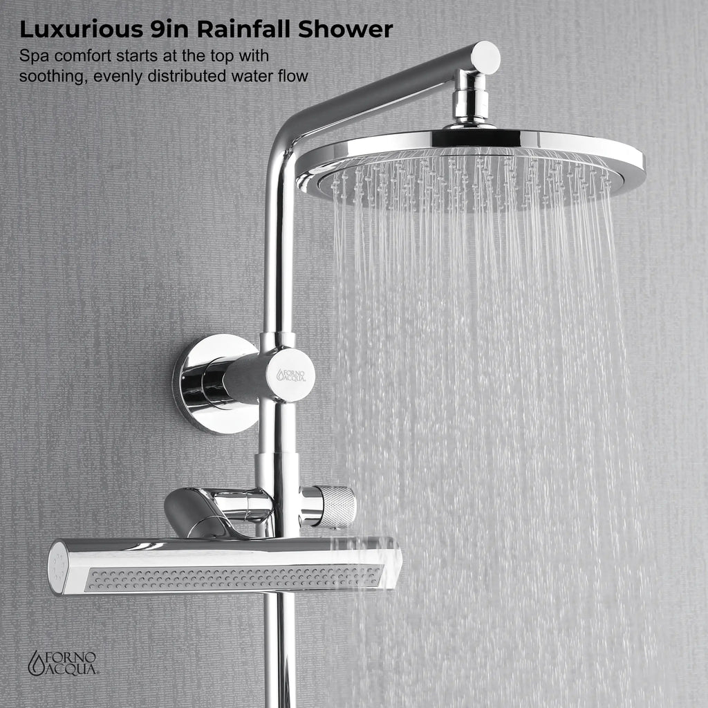Elevate your shower routine with the FORNO ACQUA AcquaSPA Shower Column, where Italian-inspired design meets innovation for a true spa experience at home. Relax beneath the oversized 9 inch. rain shower head, delivering full-body coverage with a gentle, soothing flow. The revolutionary AcquaFALL Waterfall Jet features a wide 10-1/2 in. outlet and adjustable angle, offering calming relief for shoulders, neck, and tension points. A 5-function ergonomic handheld shower slides smoothly along the integrated adjustable bar, providing flexible comfort for every family member. Designed for easy DIY installation with standard U.S. plumbing, this wall-mounted system blends modern style with lasting performance. Make every shower a moment of restoration. FORNO ACQUA AcquaSPA, luxury, functionality, and wellness in perfect balance.