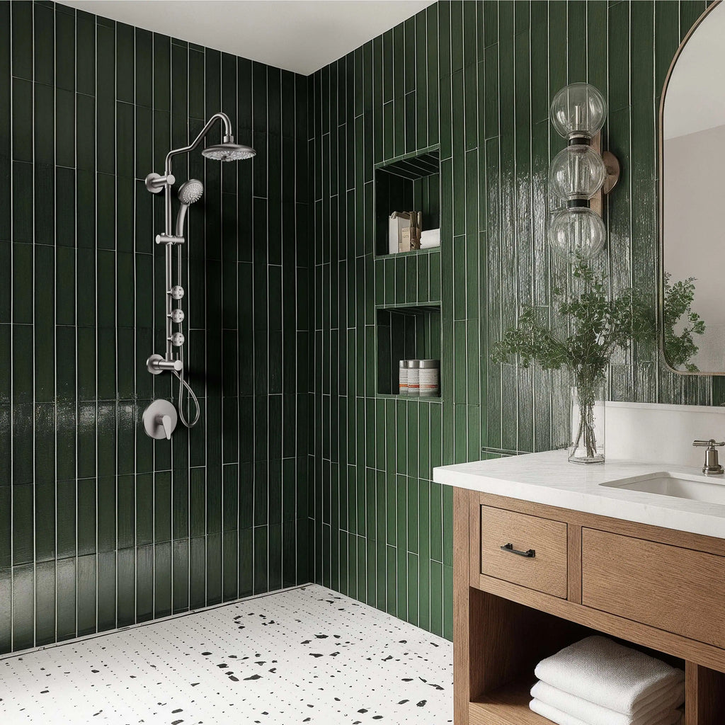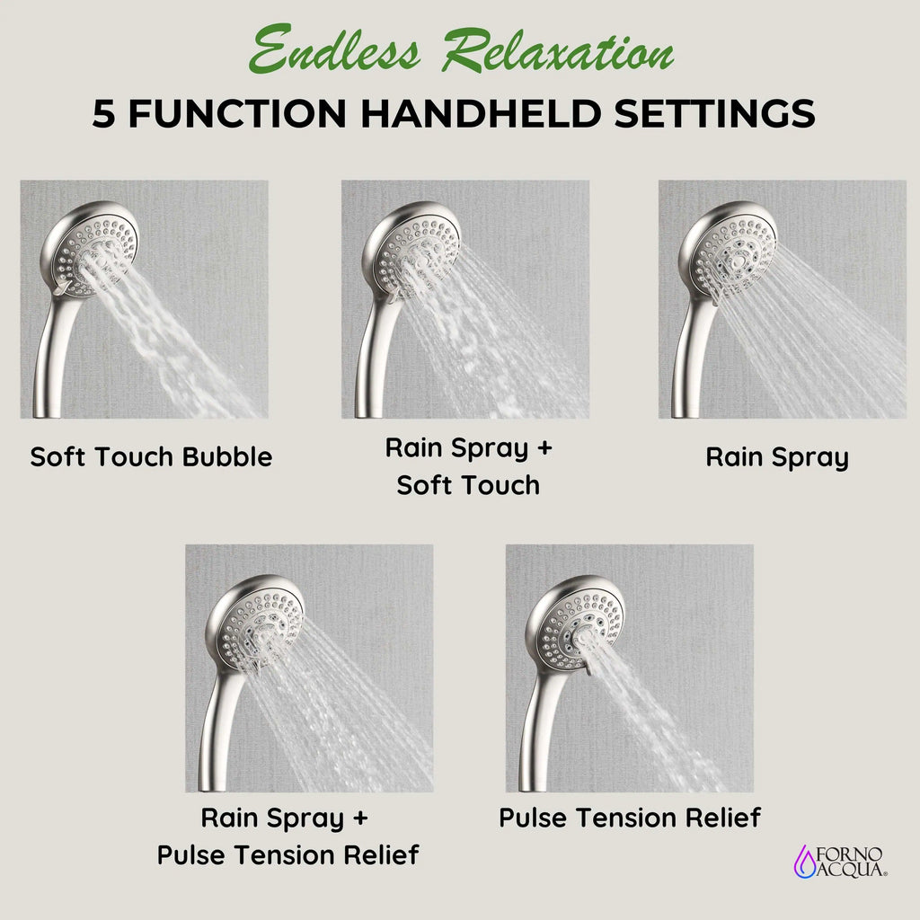 Elevate your daily routine with the FORNO ACQUA AcquaSPA Wall-Mounted Shower Column featuring a patented 6 function 8" rainfall shower head, 5 function handheld shower wand, and three adjustable body jets for a spa-like full-body experience. With a water-saving 1.8 GPM flow rate that maintains steady pressure, this sleek stainless steel column adds bold style to modern and transitional bathrooms. The intuitive 6-way diverter allows effortless control of all outlets, and installation is very simple with standard plumbing making it the perfect upgrade for any DIY bathroom remodel or home improvement project.