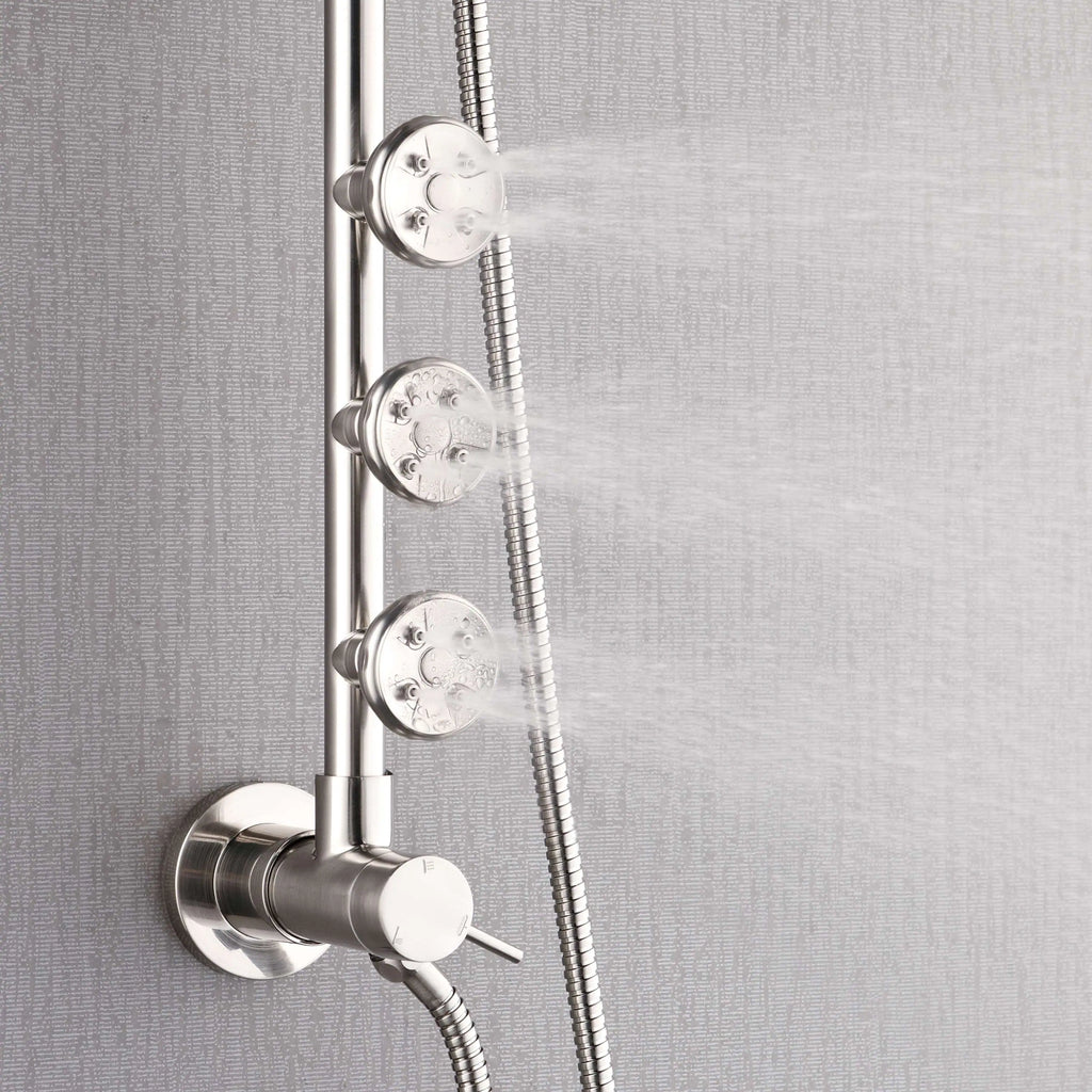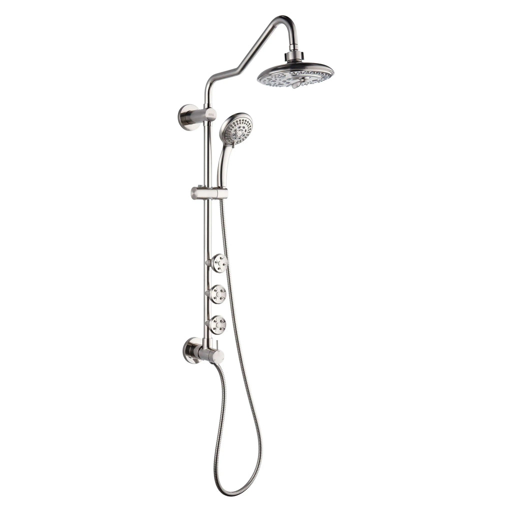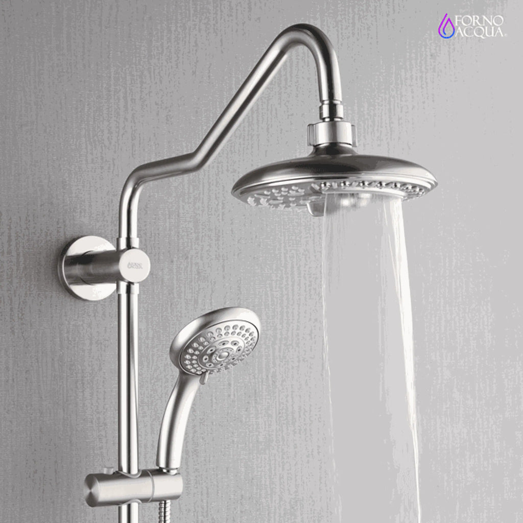 Transform your bathroom into a personal spa with the FORNO ACQUA AcquaSPA Shower column. This wall-mounted system features a 6 function 8" rain shower head, 5 function handheld, and three adjustable body jet designed to deliver full-body comfort and customizable water flow. The sleek 6-way diverter lets you combine or control water outlets effortlessly. Built from durable stainless steel with a brushed nickel finish, this bold shower solution blends modern style with long-lasting performance. Easy to install using existing plumbing, the AcquaSPA System is perfect for DIY upgrades and quick bathroom remodels. It offers the perfect balance of convenience, luxury, and design