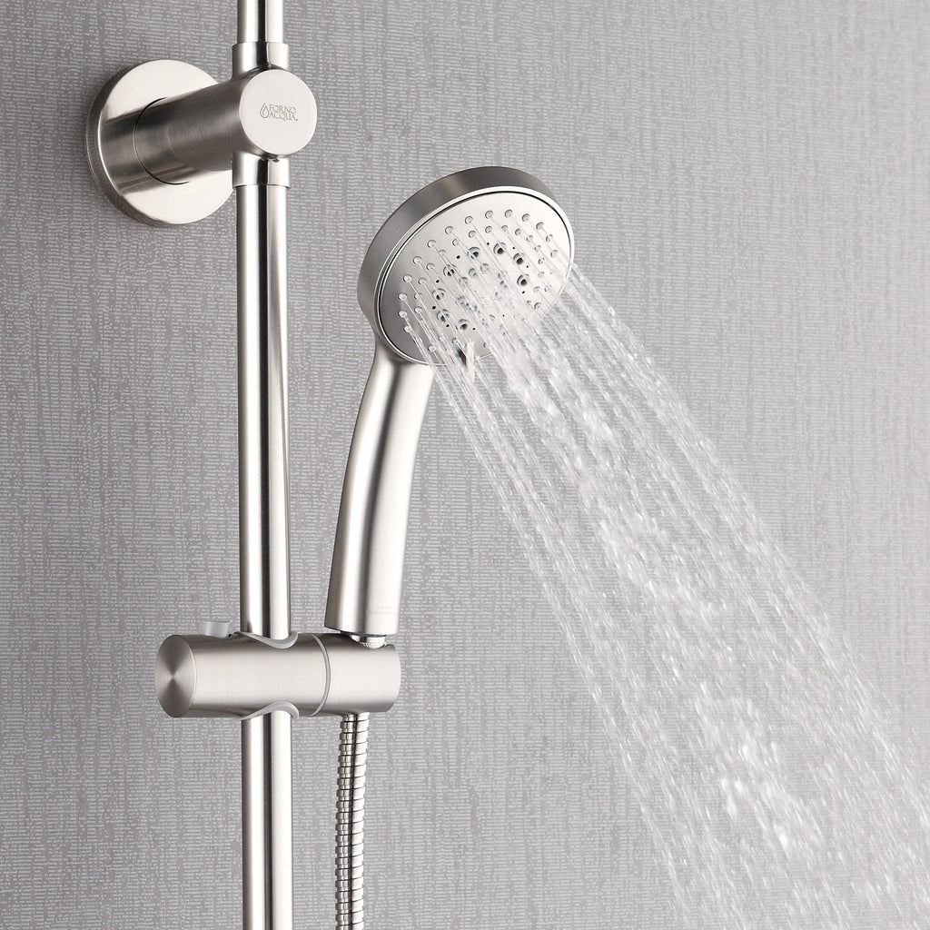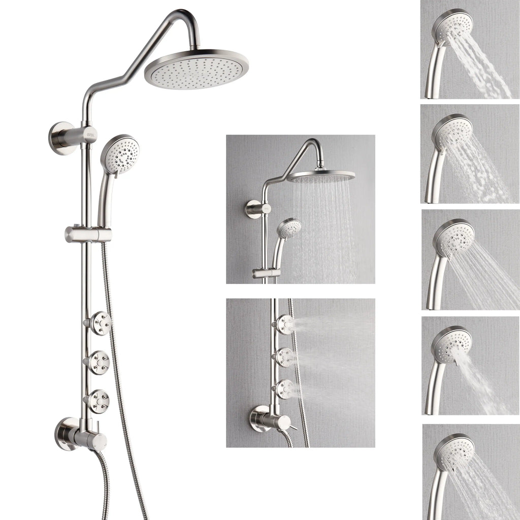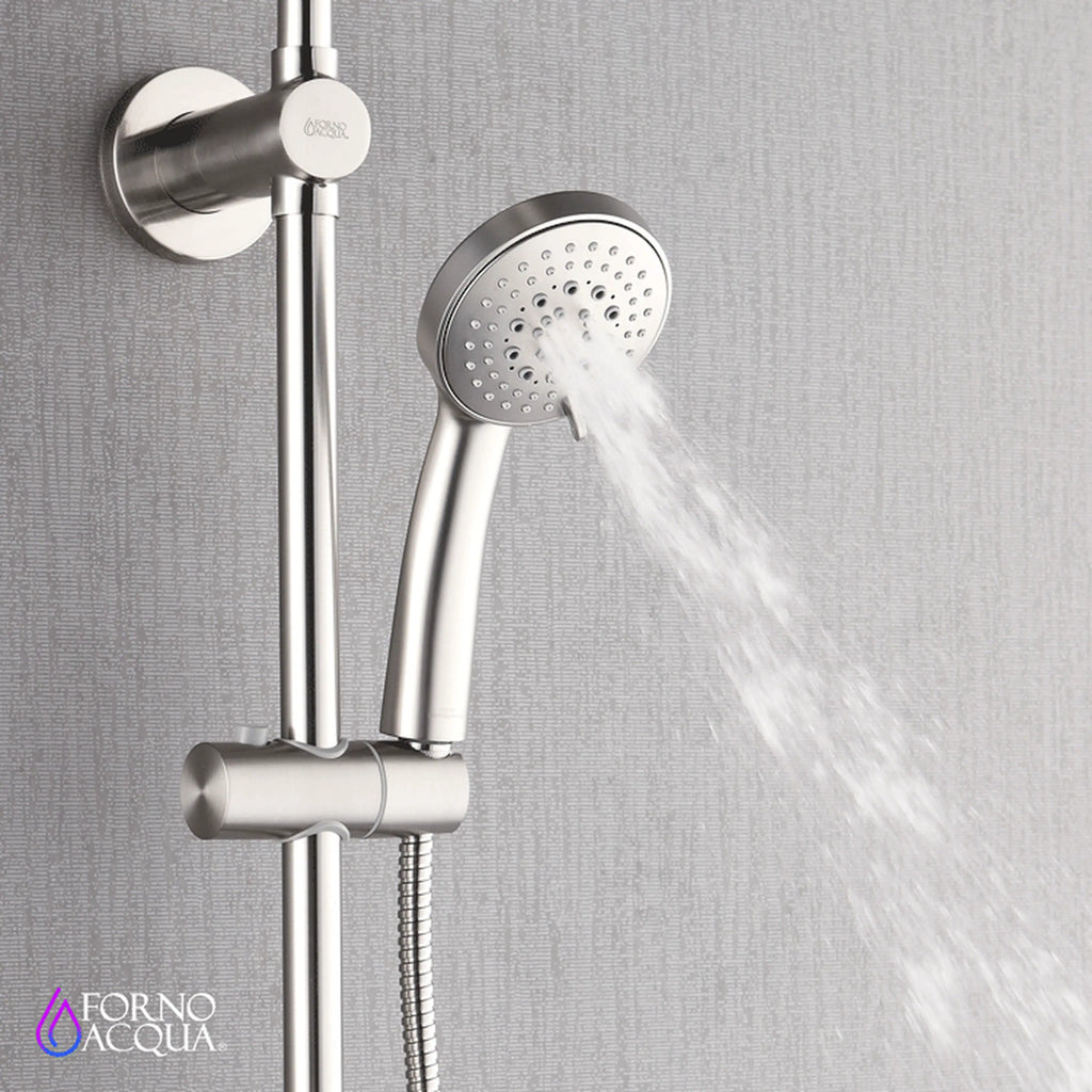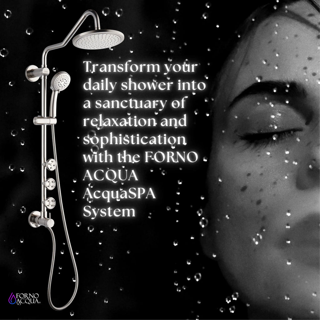 Transform your daily routine with the FORNO ACQUA AcquaSPA System where timeless design meets spa-inspired innovation. In elegant brushed nickel finish its oversized 9" rain shower head delivers soothing, full-body refreshment. Three adjustable body jets provide targeted hydrotherapy, while a 5-function ergonomic handheld adds customizable flexibility for every family member. A smooth 6-way diverter lets you control or combine water outlets with ease. Installation is simple designed to fit standard plumbing on flat or uneven walls with no renovation required. With a water-efficient yet powerful 2.5 GPM flow rate, the AcquaSPA System offers peak performance and elegance in one effortless upgrade. Perfect for classic, modern or transitional bathrooms.