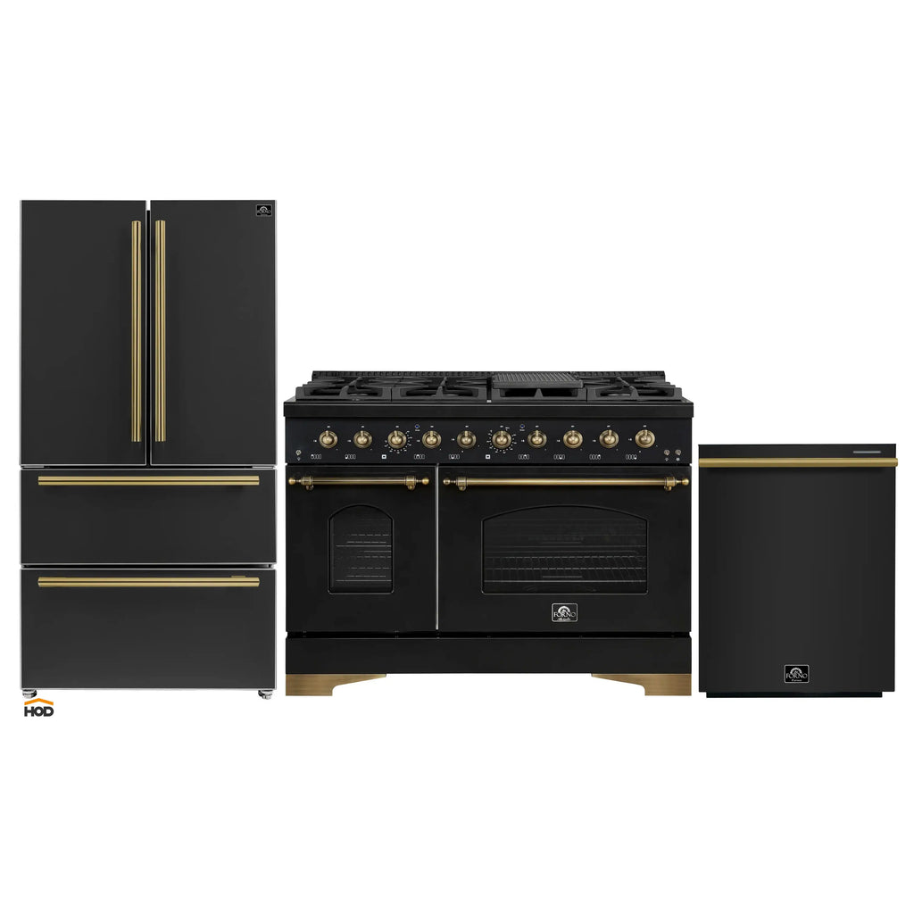 Elevate your cooking experience with the Forno Antico 48-Inch Gas Range. Featuring 8 sealed burners with a total output of 94,000 BTU, this range offers exceptional power and precision. Equipped with two dual-ring brass burners, it delivers up to 20,000 BTU for searing and as low as 1,000 BTU for delicate simmering, giving you unmatched versatility. The 3.5 cu.ft. convection oven and an additional 2 cu.ft. oven ensure ample space for all your baking and roasting needs. With a sleek black finish paired with antique brass accents, this range combines modern elegance with vintage charm. Continuous cast-iron grates provide stability, while the recessed enamel cooktop makes cleaning effortless. Backed by Forno's 2-year warranty, the Antico Gas Range delivers professional-grade performance and timeless design. Forno, lower the cost of living.