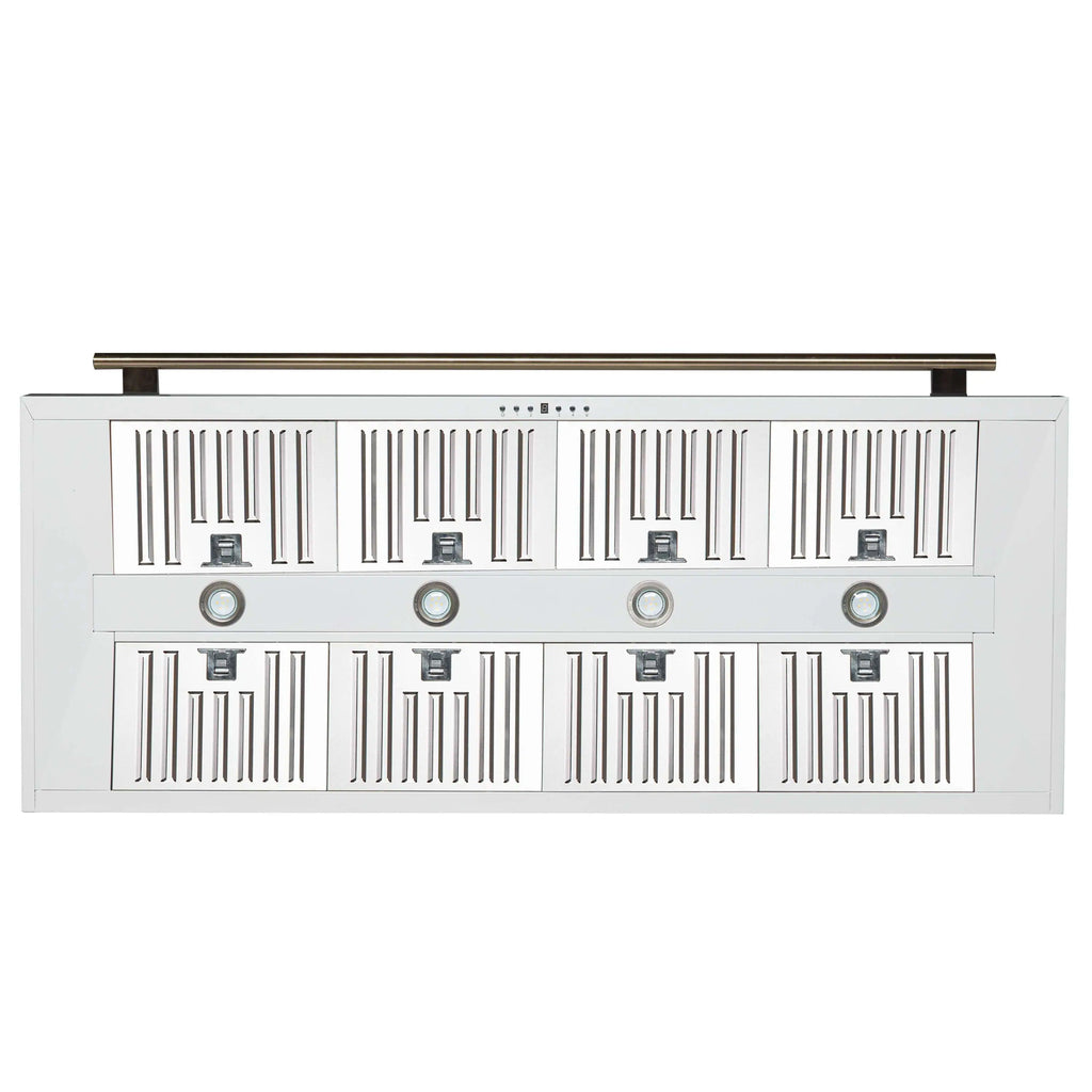 This 60 Inch Wall-Mounted Range Hood in white is designed for high-performance kitchen ventilation. With a powerful 1200 CFM motor and 4-speed fan control, it removes smoke, grease, and cooking odors. Choose between external venting or ductless recirculating installation to suit your kitchen layout. The vertical upward air discharge ensures efficient airflow, while features like automatic shut-off, a built-in timer, and removable charcoal filters make it convenient to use and maintain. The included chimney extension kit and decorative crown molding allow for a custom, built-in look. Quiet operation at just 68 dB with built-in lighting for better visibility while cooking.