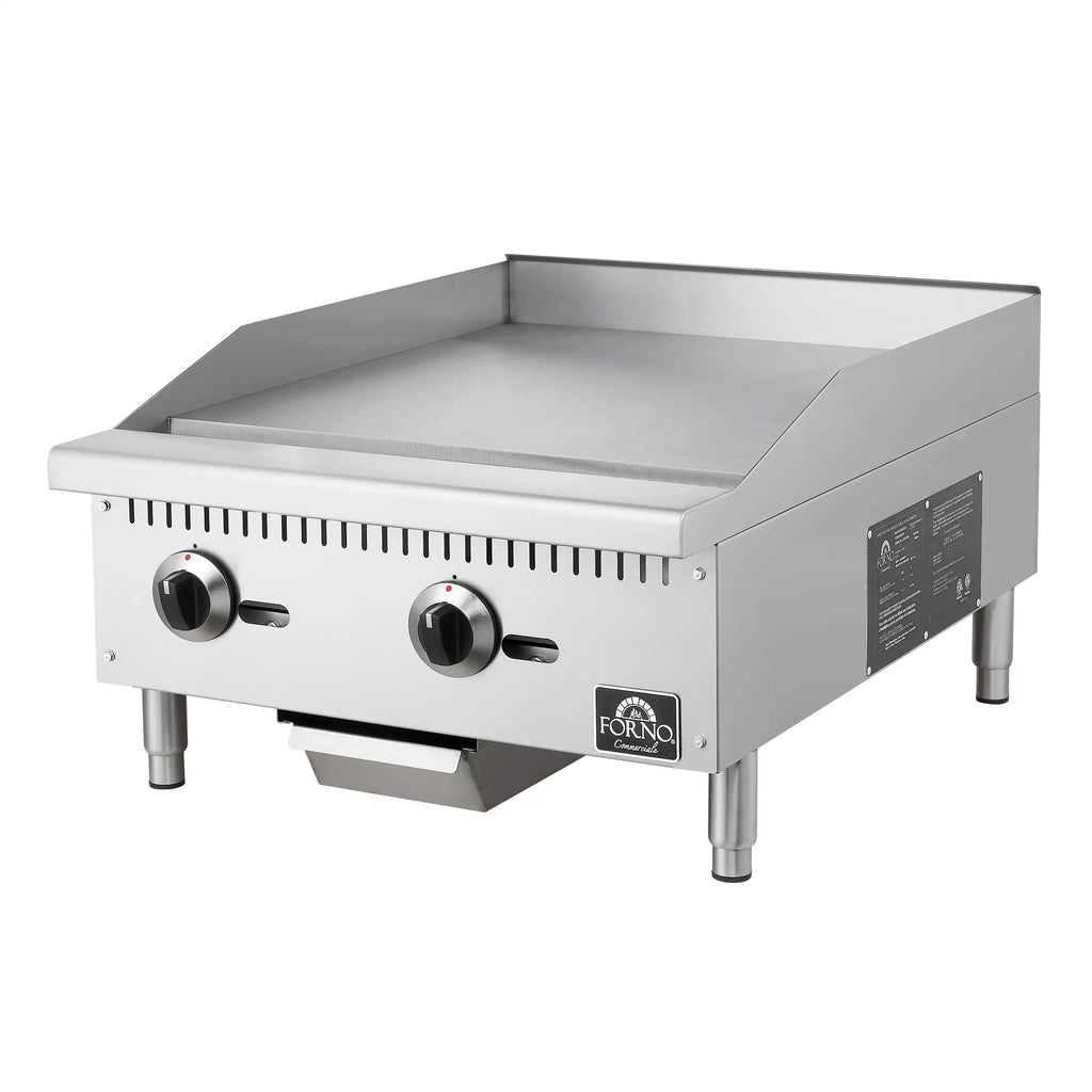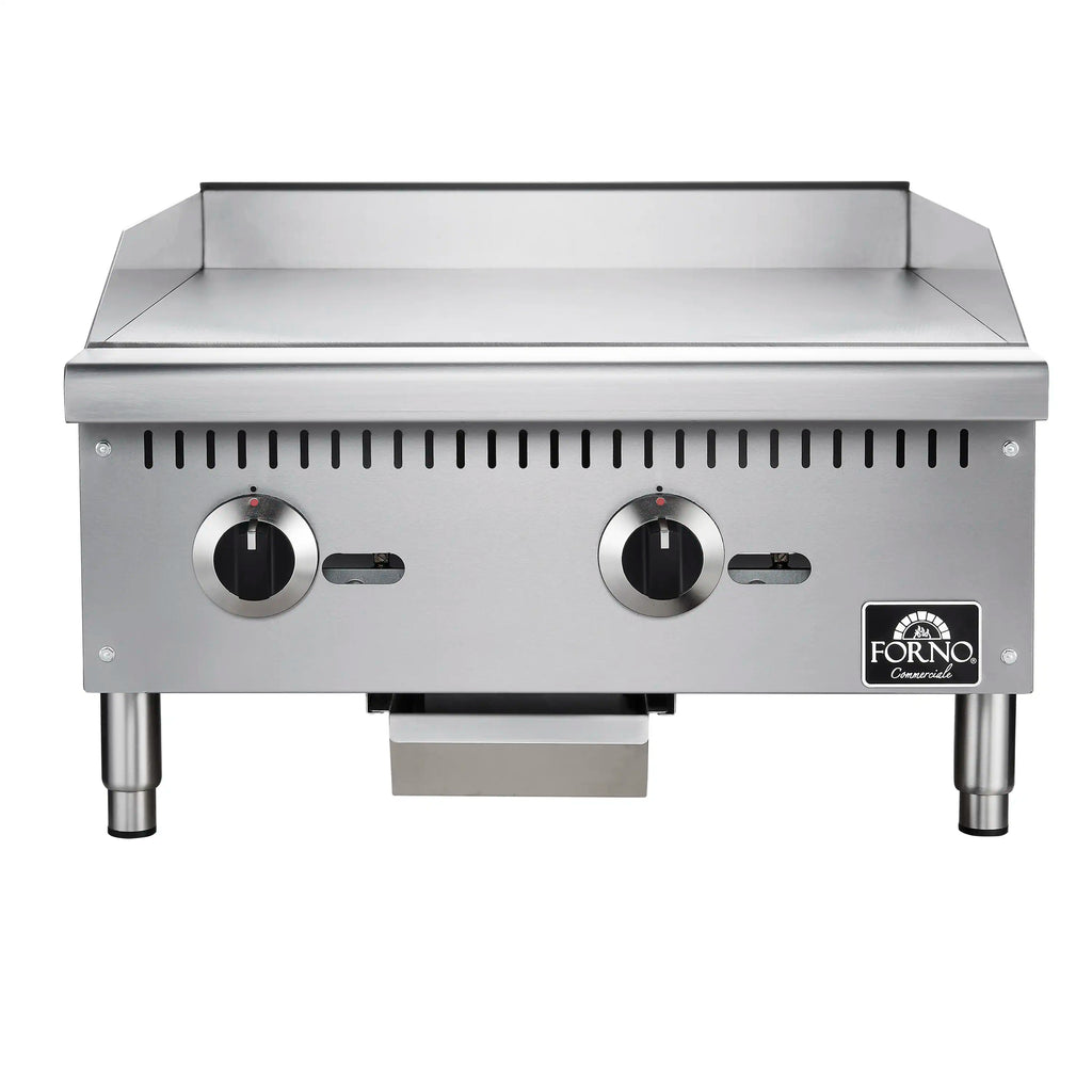 This 24 Inch Commercial Gas Griddle delivers 60,000 BTUs of cooking power with two burners and a heavy duty 1 inch carbon steel griddle plate. Built from durable stainless steel 430, it features a 33-inch depth for a larger cooking area, fully welded splash guards, and a cool to the touch stainless steel front edge. An easy-to-remove 4.5 quart grease drawer with weep hole simplifies cleanup, while adjustable non-skid feet ensure stability. Designed for natural gas with a standing pilot ignition system, this griddle also includes an LP conversion kit for versatile installation in restaurants, diners, and food trucks.
