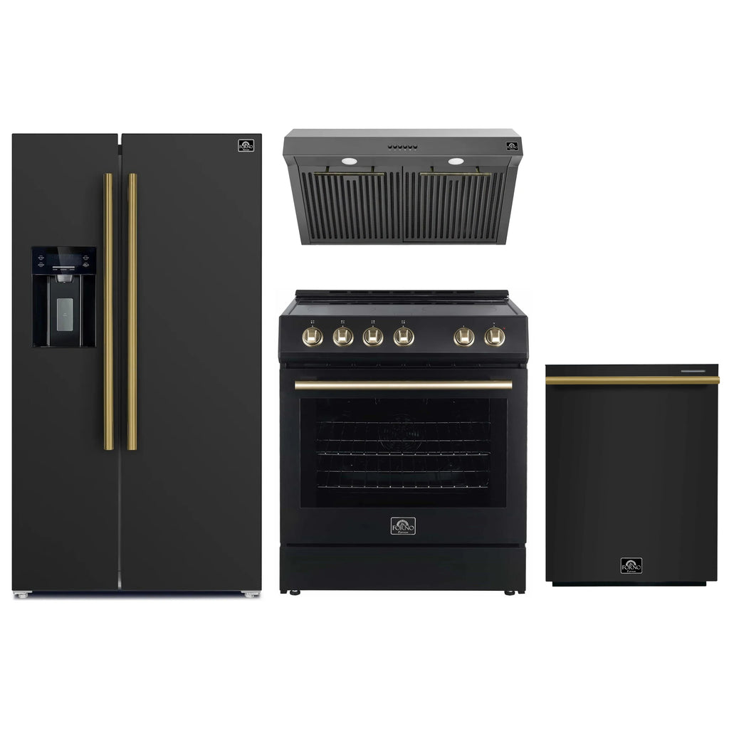 Introducing the Forno Leonardo Espresso 30" 5.0 cu. Ft. Black Electric Range, a kitchen game-changer. With Antique Brass accents, 4 Radiant Elements, and a 5,500-watt Convection Oven, it combines style with top-notch performance. Antique Brass Knobs and Handles add a touch of elegance, while Ceramic Glass ensures even heat distribution. The Hidden Bake Element simplifies maintenance by preventing spills and odors. Elevate your kitchen with this timeless, user-friendly range, marrying durability with sophistication. Cook with confidence, and embrace efficiency and style with every use.