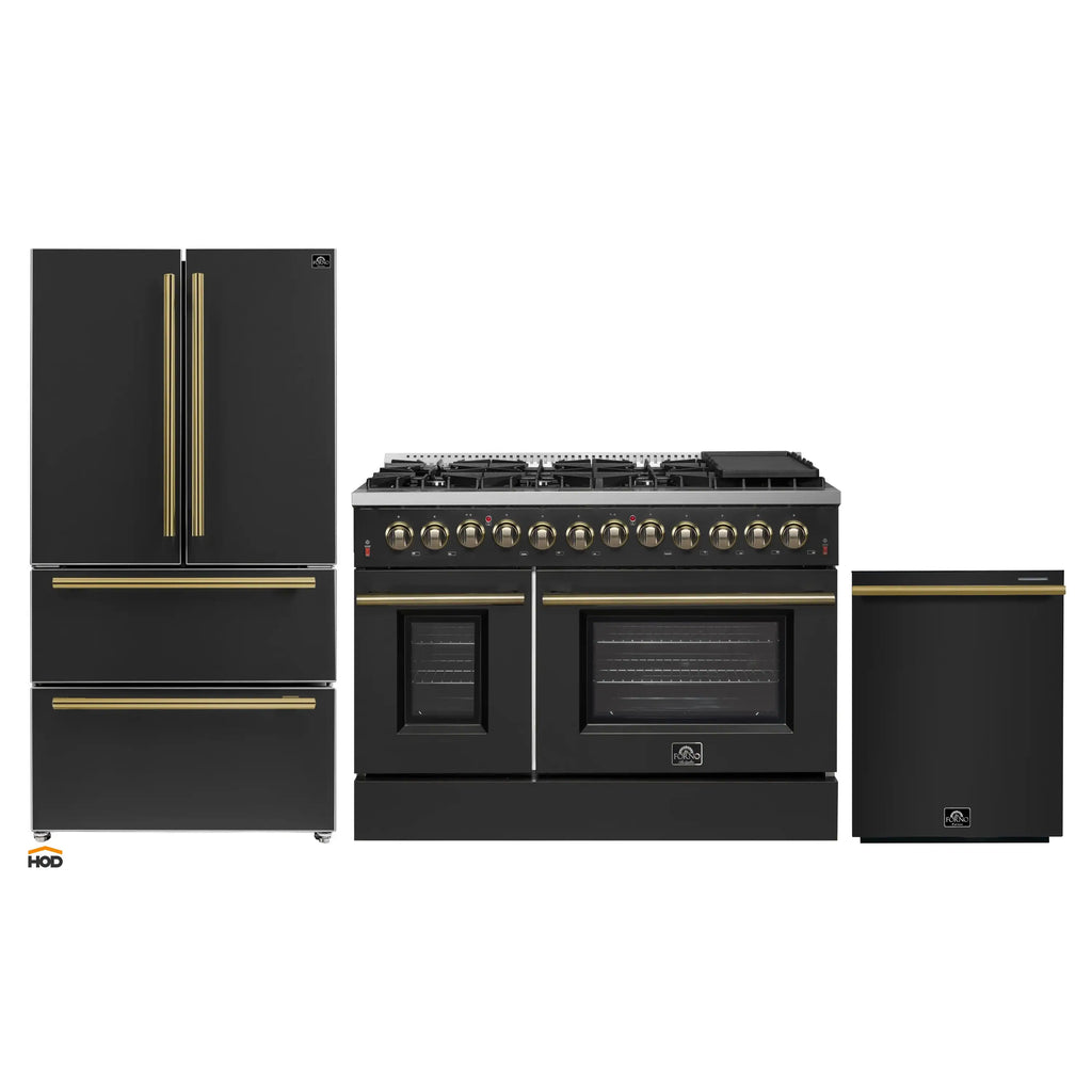 The Forno Galiano 48" Dual Fuel Range in sleek black with antique brass knobs and handles brings bold elegance and professional performance to your kitchen. Eight sealed burners produce 107,000 BTU, including a versatile 20,000 BTU dual-ring burner for simmering at 1,000 BTU. Dual ovens provide 6.58 cu.ft. total capacity: the 4.32 cu.ft. true convection oven with 6,300-watt output ensures consistent results, while the 2.26 cu.ft. secondary oven with 3,400 watts adds flexibility. Black enamel interiors simplify cleaning, while friction hinges and 3-layer glass doors enhance durability and safety. Includes 4 racks, griddle, LP conversion kit, and NEMA 14-50P power cord. Forno’s 2-year in-house warranty guarantees peace of mind.