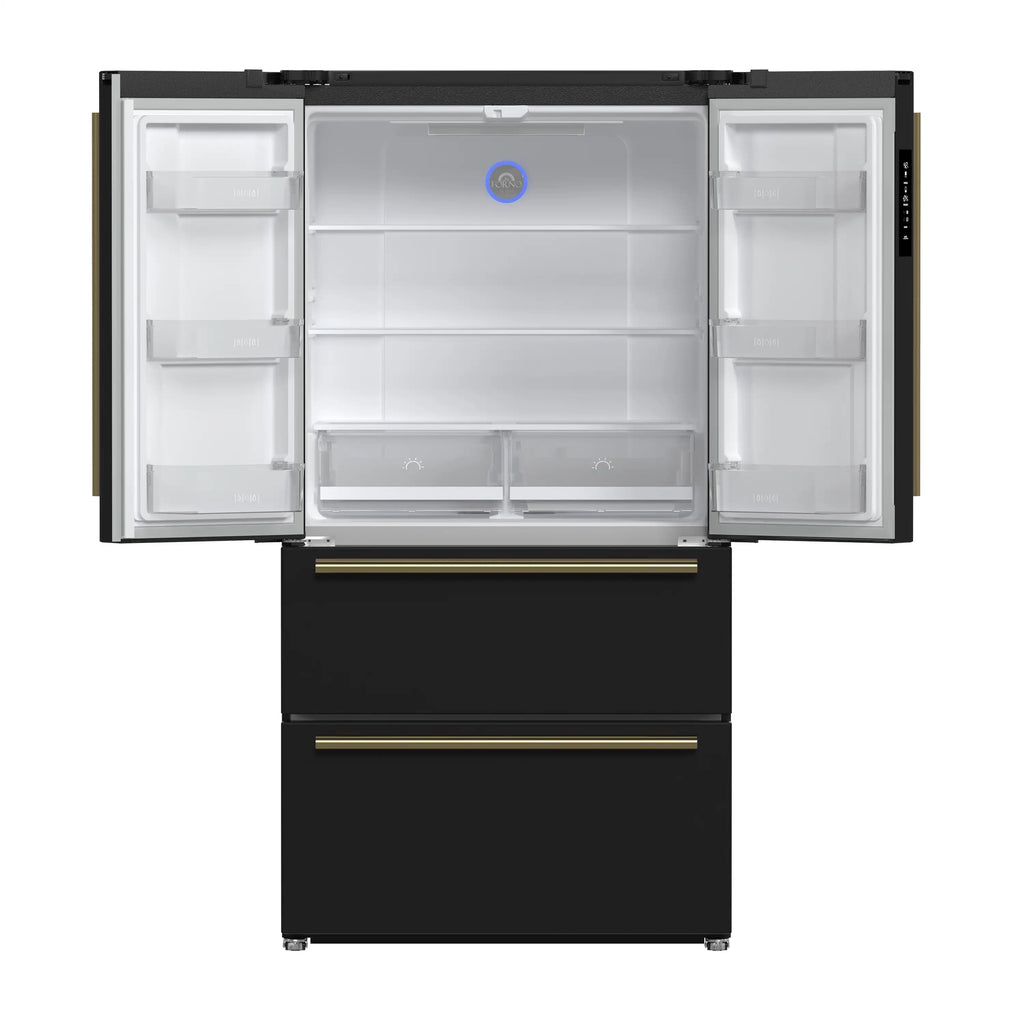 Upgrade your kitchen with the Forno Moena 36" Built-In French Door Refrigerator in black with antique brass handles, designed for seamless integration and premium performance. Powered by a high-efficiency inverter compressor, it ensures energy savings, quiet operation, and precise temperature control to keep your food fresher for longer. The frost-free multi-airflow cooling system maintains consistent temperatures throughout its 19.2 cu. ft. capacity, providing optimal food preservation with adjustable shelving for versatile storage. The 12.1 cu. ft. fresh food section includes three glass shelves (two adjustable), two drawers, and generous door storage to keep groceries organized. The 7.2 cu. ft. freezer offers two pull-out drawers, a slide-out tray, and an automatic ice maker producing up to 4 pounds of ice daily, ensuring convenience for every occasion. With an intuitive LED touch panel, you can effortlessly control temperature settings and functions. Energy Star Certified, this built-in French door refrigerator operates efficiently while minimizing food spoilage with bright, high-efficiency LED lighting for superior visibility.