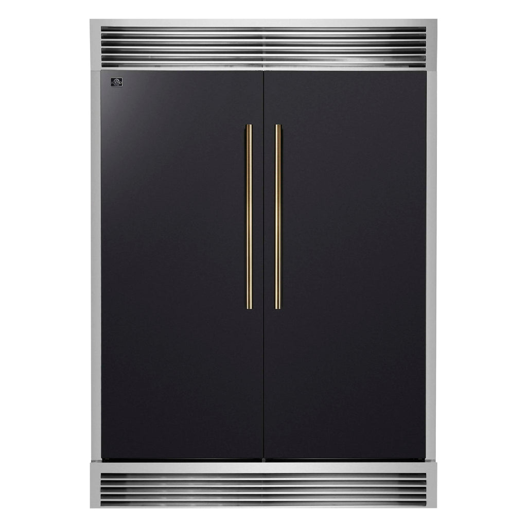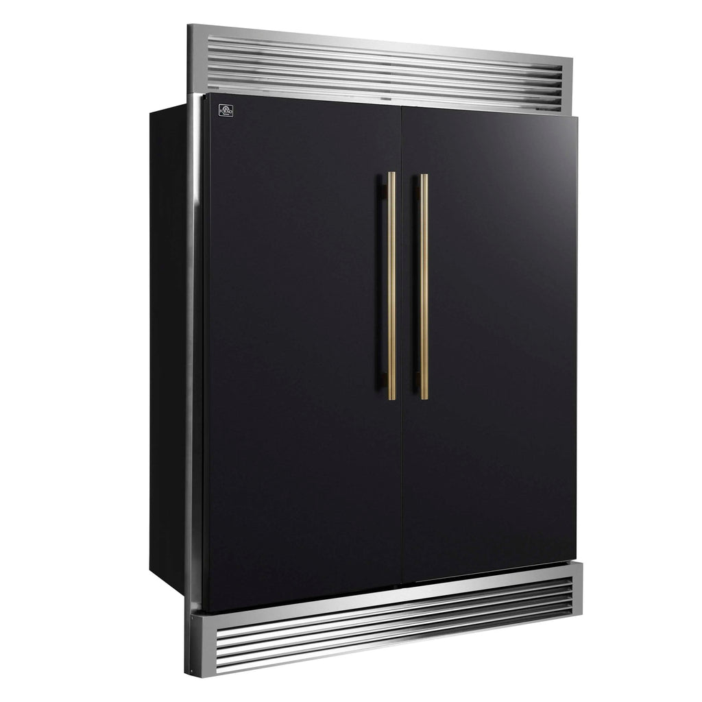 The Forno Maderno provides a premium 60 inch built-in refrigerator look by combining two 28 inch units with a trim grill for seamless side-by-side installation. This fridge freezer combo comes in a black finish with antique brass handles as part of our Espresso line, adding a boldness to any modern kitchen. With a total capacity of 27.2 cu.ft., it's ideal for large households or serious entertainers. Inside, you’ll find Convertible Cooling Zones that let you switch between refrigerator and freezer mode, Total No-Frost technology to prevent icy build-up, and a sleek digital control panel for easy adjustments. The Maderno includes six tempered glass shelves with silver trim, six storage drawers, and bright LED lighting to help keep everything organized and easy to find. VCM-coated doors and a durable metal back panel add strength and a fingerprint-resistant finish. Energy Star certification ensures this side-by-side built-in refrigerator is energy efficient.