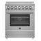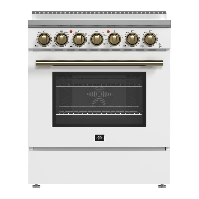 The Forno Paolo 30" Freestanding Electric Range in white, the ultimate kitchen upgrade. This stunning range merges style and top-tier performance with an elegant white finish, complemented by a stainless steel surround on the ceramic glass cooktop. This design ensures even heat distribution across its 5 radiant elements with a total output of 7,800 watts. The oven features a powerful 1,200-watt true convection system, combined with a total bake and broil output of 3,800 watts, delivering faster, more even cooking results. The hidden bake element simplifies maintenance by preventing spills from burning onto the element, reducing odors, and making cleanup effortless. The bright halogen interior oven lighting and large viewing window allow you to monitor your cooking progress without opening the door and losing heat.