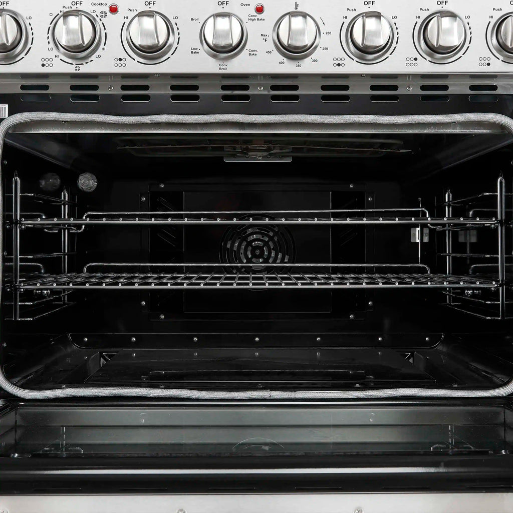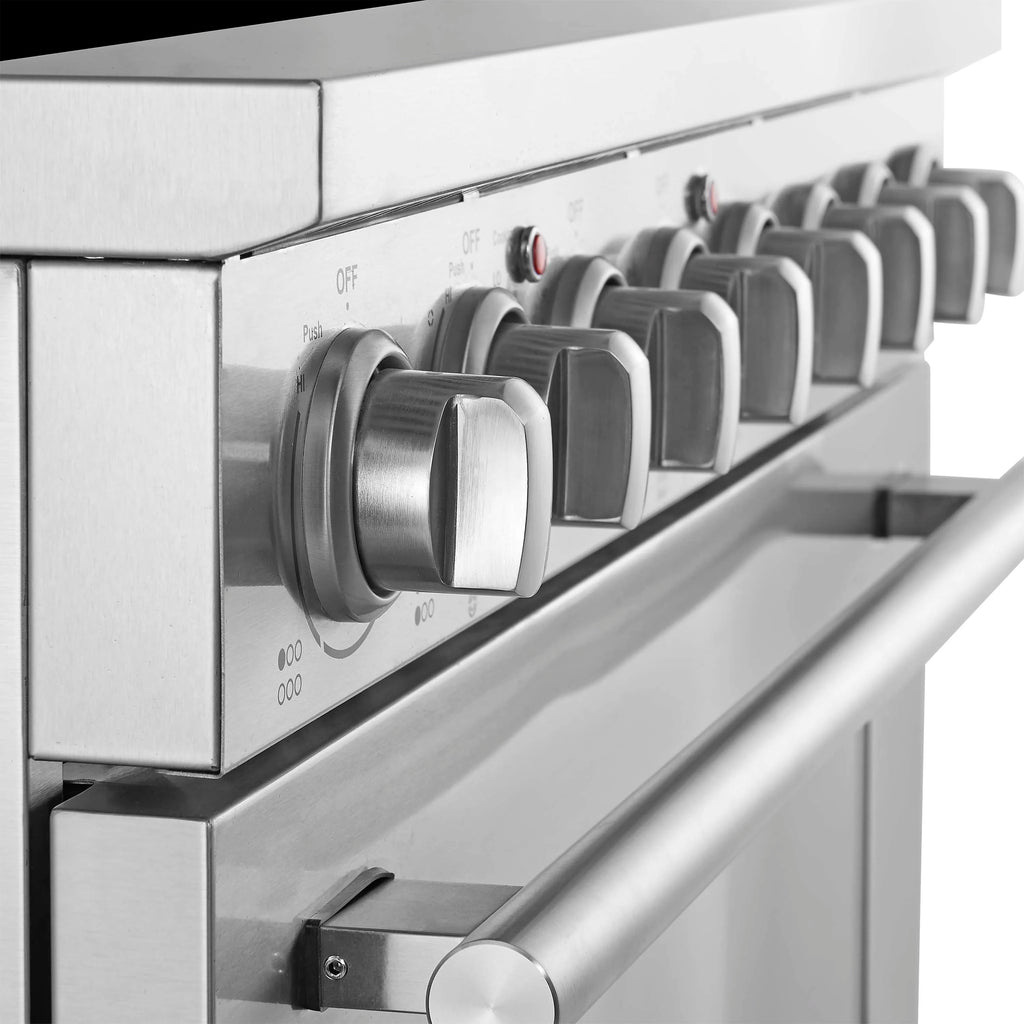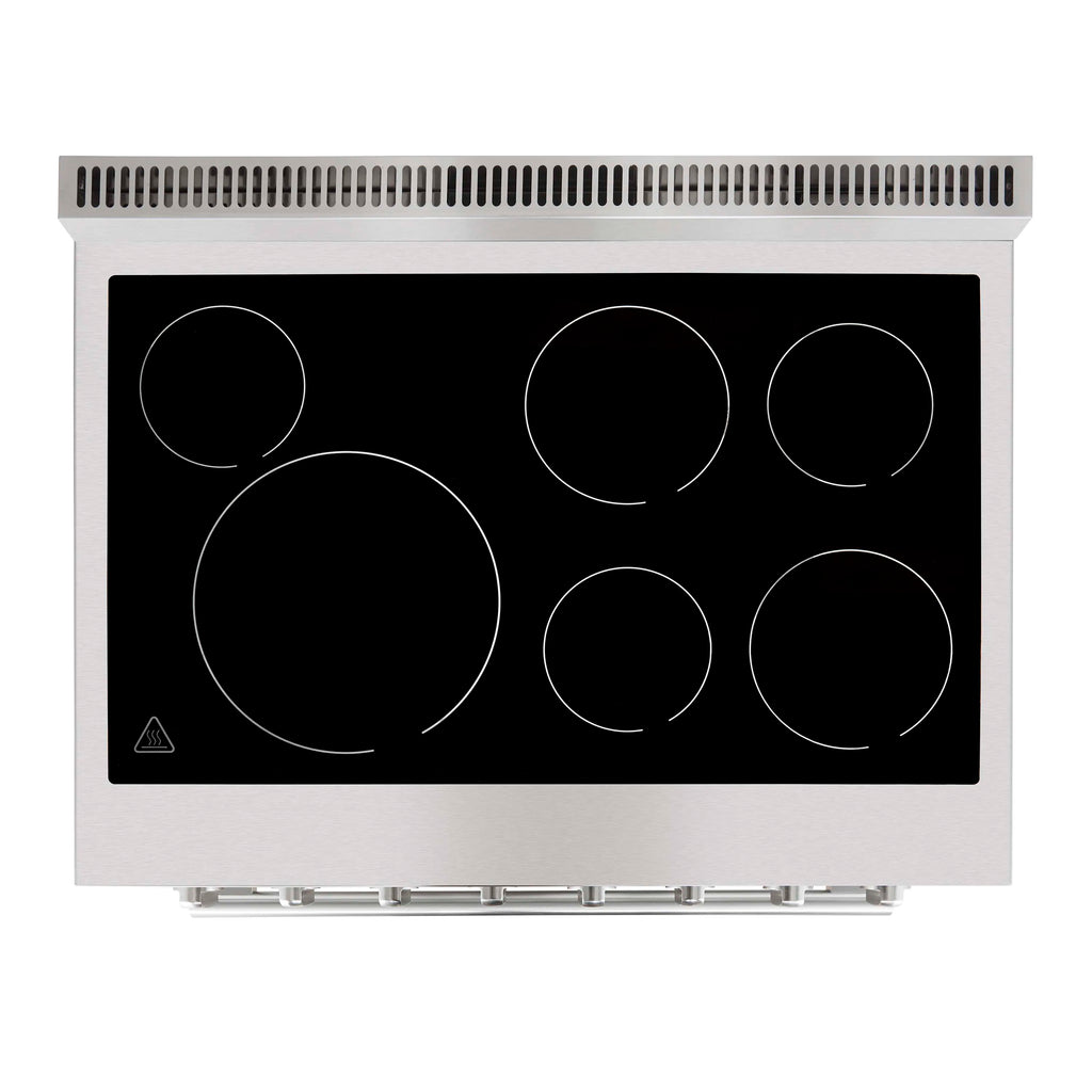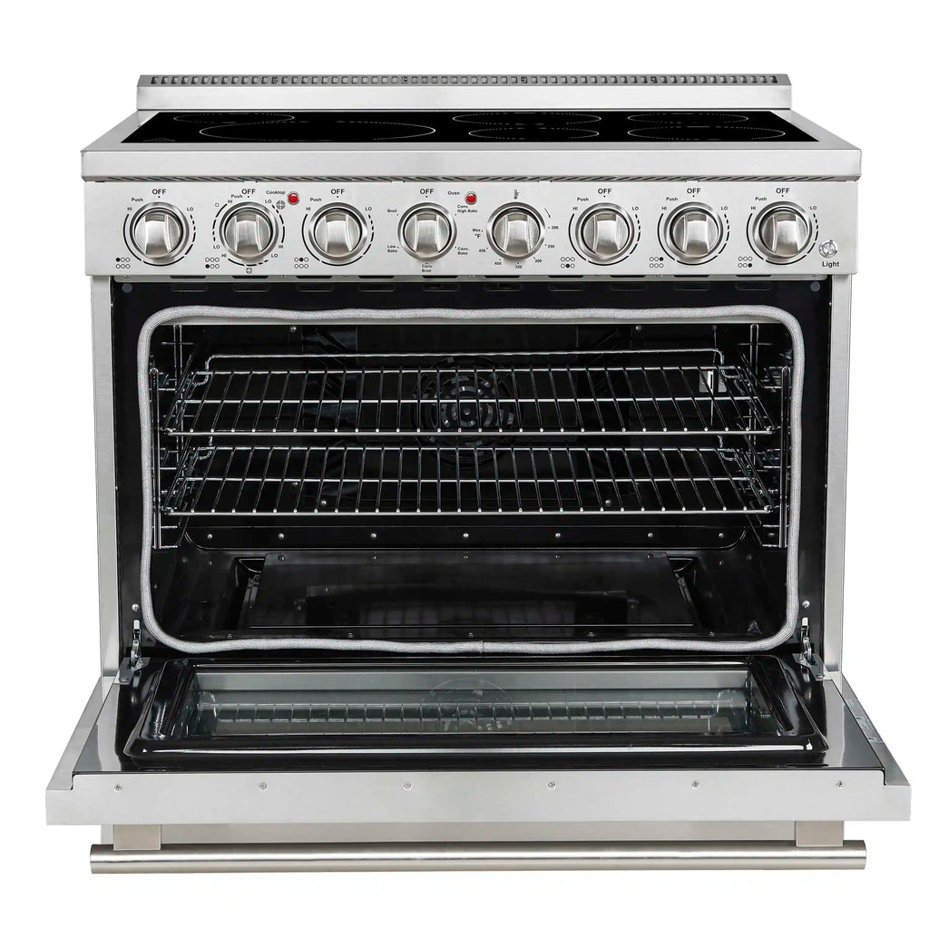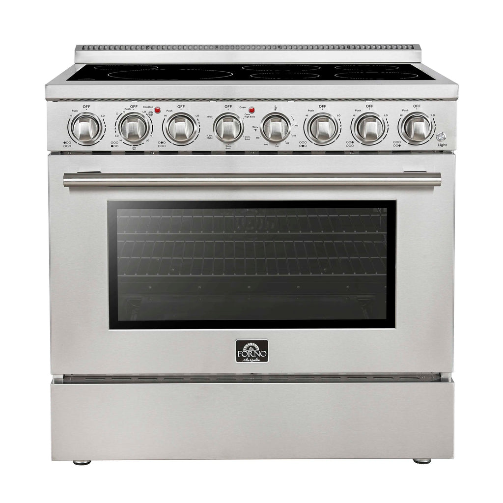 The Forno Paolo 36 Inch electric range in stainless steel combines power and style for the modern kitchen. Its smooth ceramic glass cooktop features five radiant elements with 9,800 watts of total output. The 5.44 cu. ft. true convection oven delivers fast, even results with a 1,200-watt fan and 3,000-watt high-powered baking and broiling elements. A hidden bake element, bright halogen lights, and a large viewing window add convenience. This freestanding electric range also includes a 100-watt warming zone and dual-element broiler for precise, high-heat cooking.