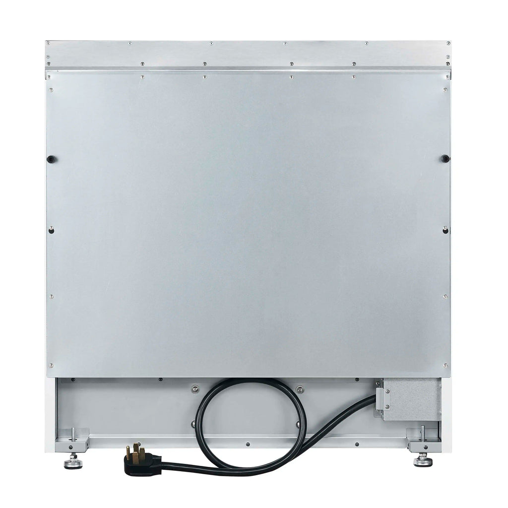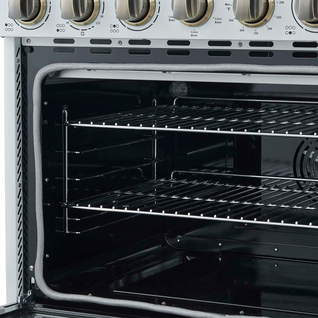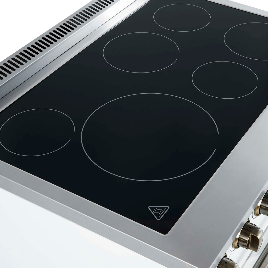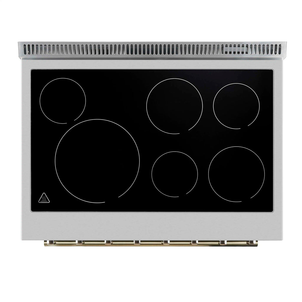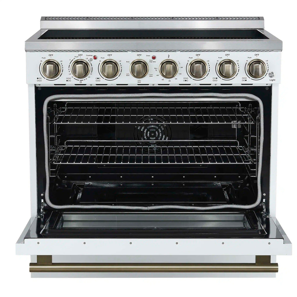 The Forno Paolo 36 Inch electric range in white with antique brass knobs and handles combines power and style for the modern kitchen. Its smooth ceramic glass cooktop features five radiant elements with 9,800 watts of total output. The 5.44 cu. ft. true convection oven delivers fast, even results with a 1,200-watt fan and 3,000-watt high-powered baking and broiling elements. A hidden bake element, bright halogen lights, and a large viewing window add convenience. This freestanding electric range also includes a 100-watt warming zone and dual-element broiler for precise, high-heat cooking.
