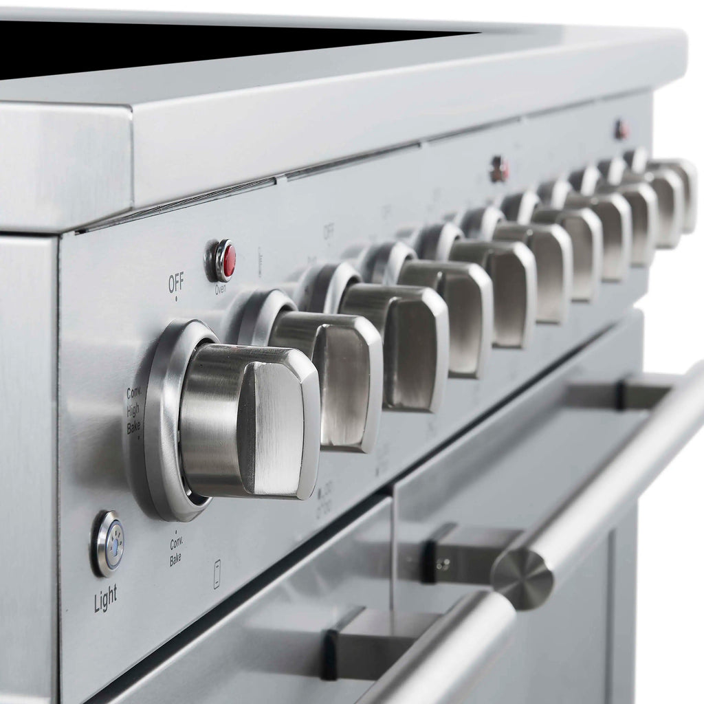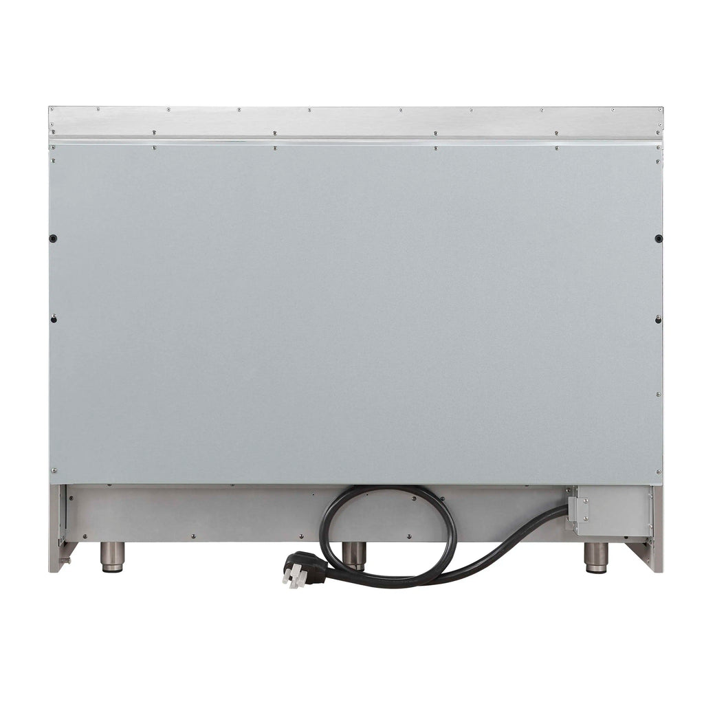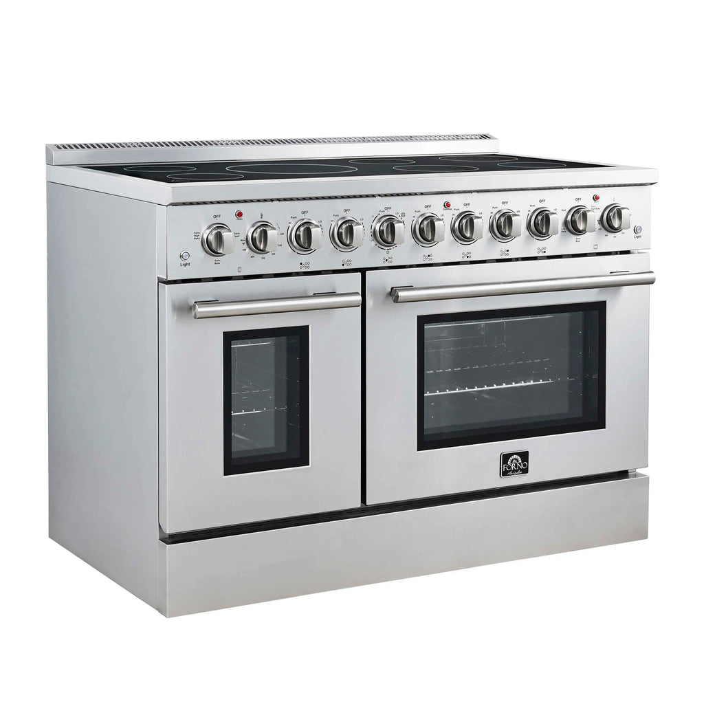 The Forno Paolo 48 Inch Electric Range in Stainless Steel combines power and style for the modern kitchen. Its smooth ceramic glass cooktop features seven radiant elements with 11,000 watts of total output. The total 6.70 cu. ft. true convection ovens deliver fast, even results with a 1,200 watt fan and 3,000 watt high-powered baking and broiling elements. A hidden bake element, bright halogen lights, and a large viewing window add convenience. This freestanding electric range also includes a 100 watt warming zone and dual-element broiler for precise, high-heat cooking.