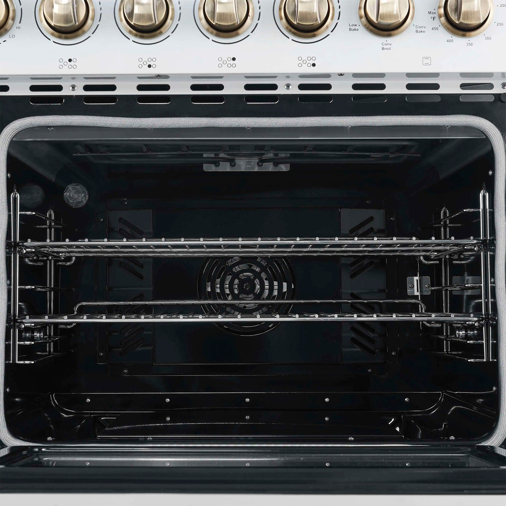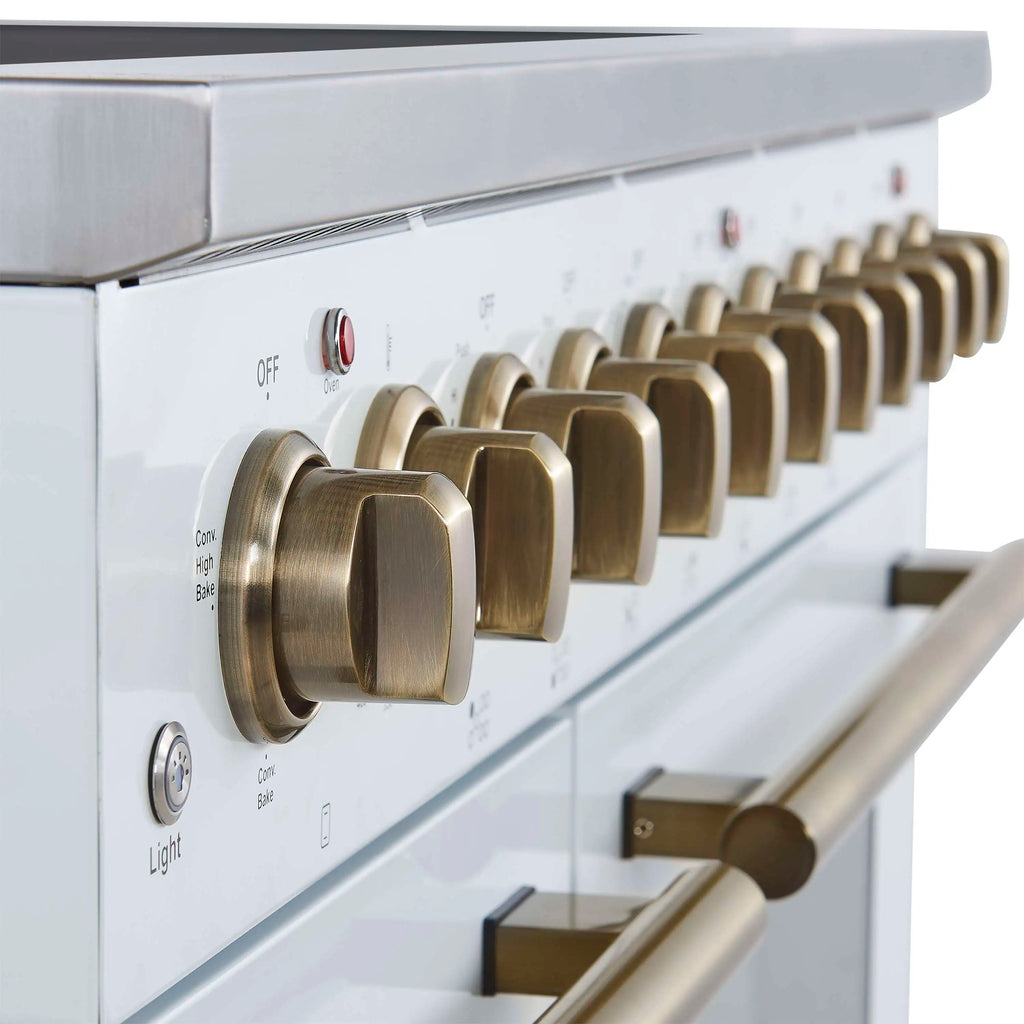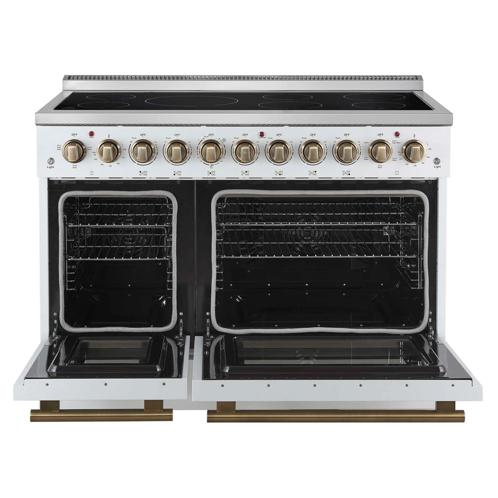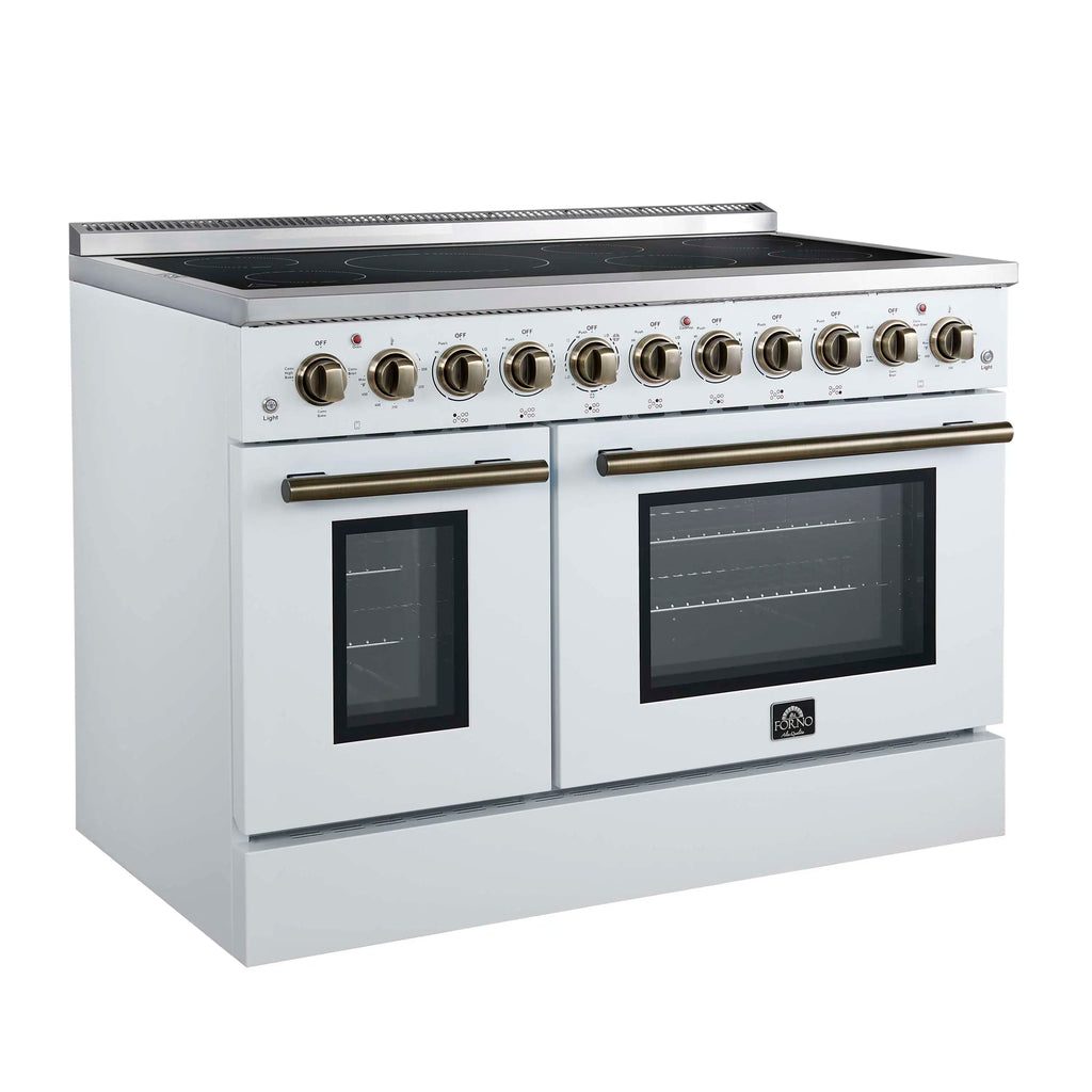The Forno Paolo 48 Inch Electric Range in White with Antique Brass Knobs and Handles combines power and style for the modern kitchen. Its smooth ceramic glass cooktop features seven radiant elements with 11,000 watts of total output. The total 6.70 cu. ft. true convection ovens deliver fast, even results with a 1,200 watt fan and 3,000 watt high-powered baking and broiling elements. A hidden bake element, bright halogen lights, and a large viewing window add convenience. This freestanding electric range also includes a 100 watt warming zone and dual-element broiler for precise, high-heat cooking.