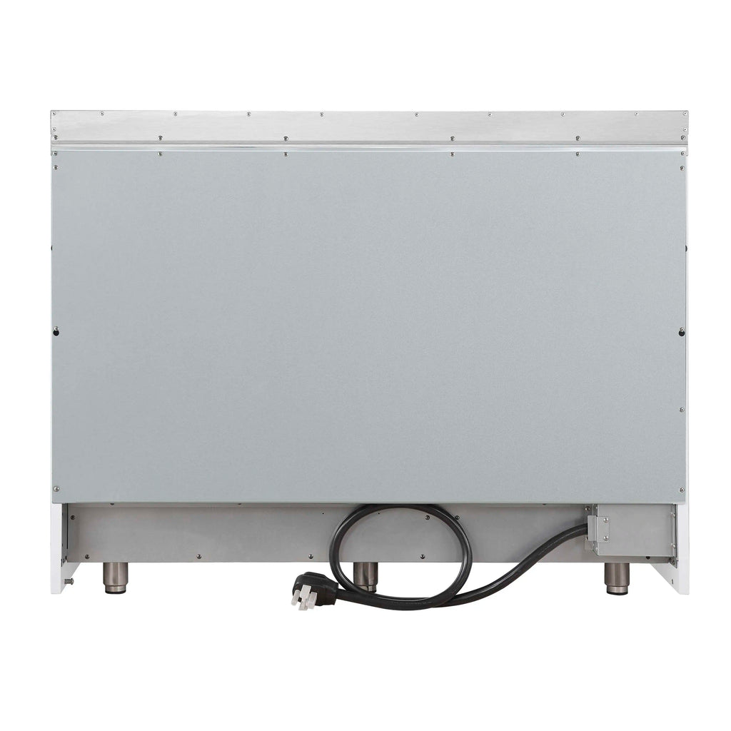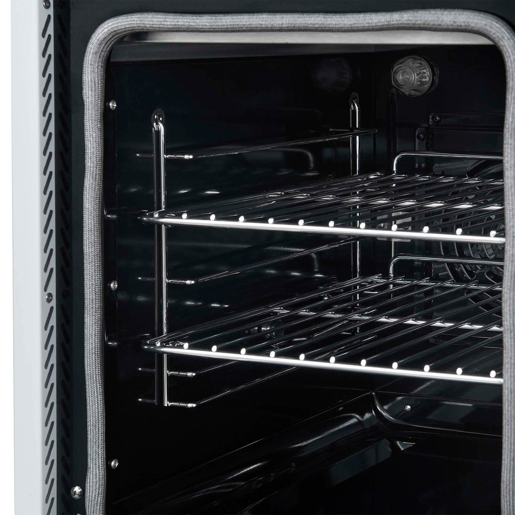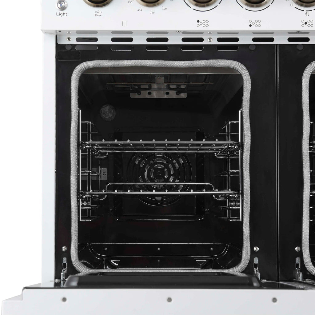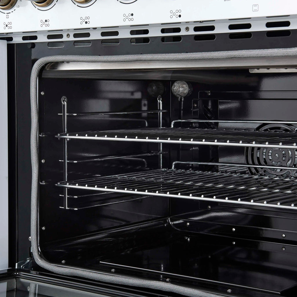 The Forno Paolo 48 Inch Electric Range in White with Antique Brass Knobs and Handles combines power and style for the modern kitchen. Its smooth ceramic glass cooktop features seven radiant elements with 11,000 watts of total output. The total 6.70 cu. ft. true convection ovens deliver fast, even results with a 1,200 watt fan and 3,000 watt high-powered baking and broiling elements. A hidden bake element, bright halogen lights, and a large viewing window add convenience. This freestanding electric range also includes a 100 watt warming zone and dual-element broiler for precise, high-heat cooking.