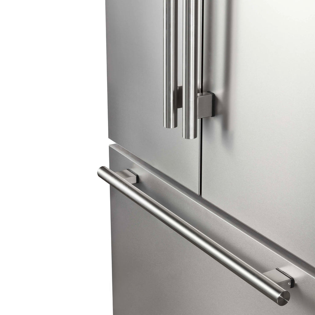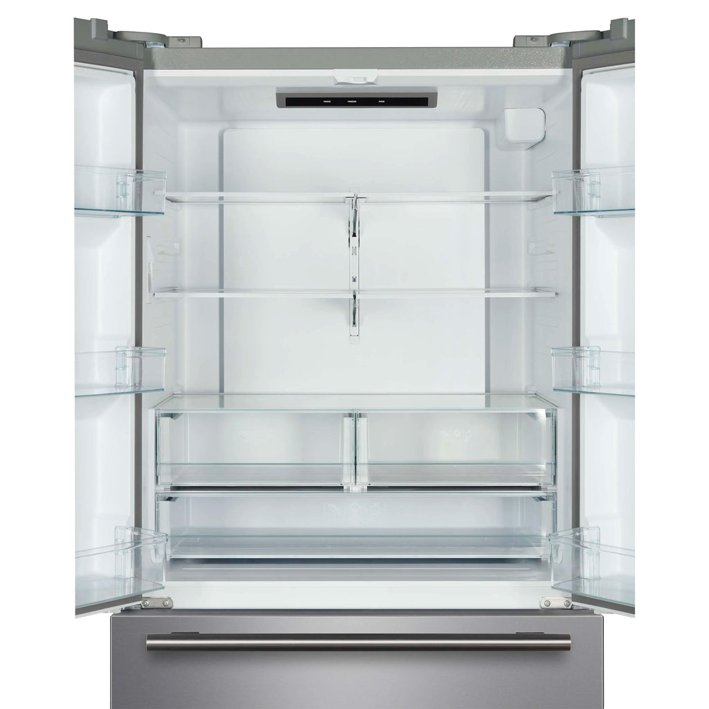 The Rivello 36 Inch French Door Refrigerator in Stainless Steel offers spacious, energy-efficient cooling with a sleek, smudge-resistant finish. The adjustable fresh food shelves and transparent door bins make it easy to organize your groceries, while the internal water dispenser and filtered ice system deliver convenience without cluttering the exterior. A full-width freezer drawer with removable ice bin and fast freeze function keeps frozen foods accessible and fresh. This automatic defrost, frost-free fridge is Energy Star certified and built for freestanding installation, making it a practical choice for modern kitchens.