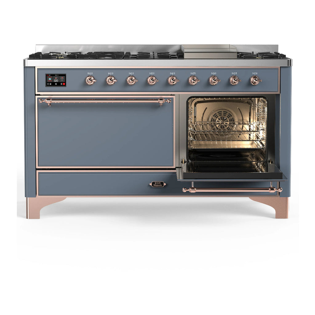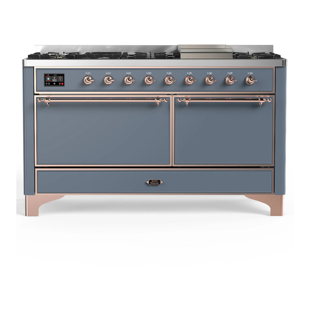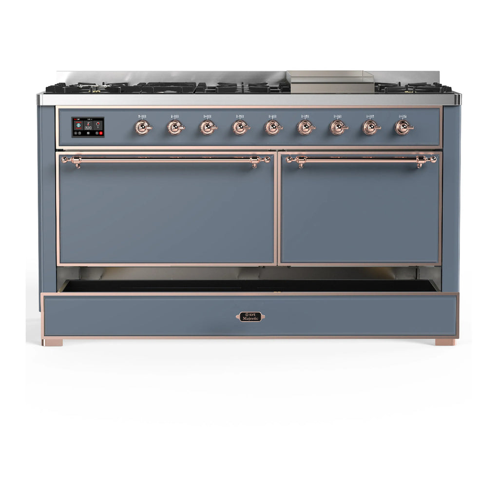 ILVE Majestic III 60-inch Dual Fuel Range with 5 Liquid Propane Burner, Griddle and Solid Door Electric Oven in Blue Grey with Copper Trim (UM60FQNR3BGPLP)