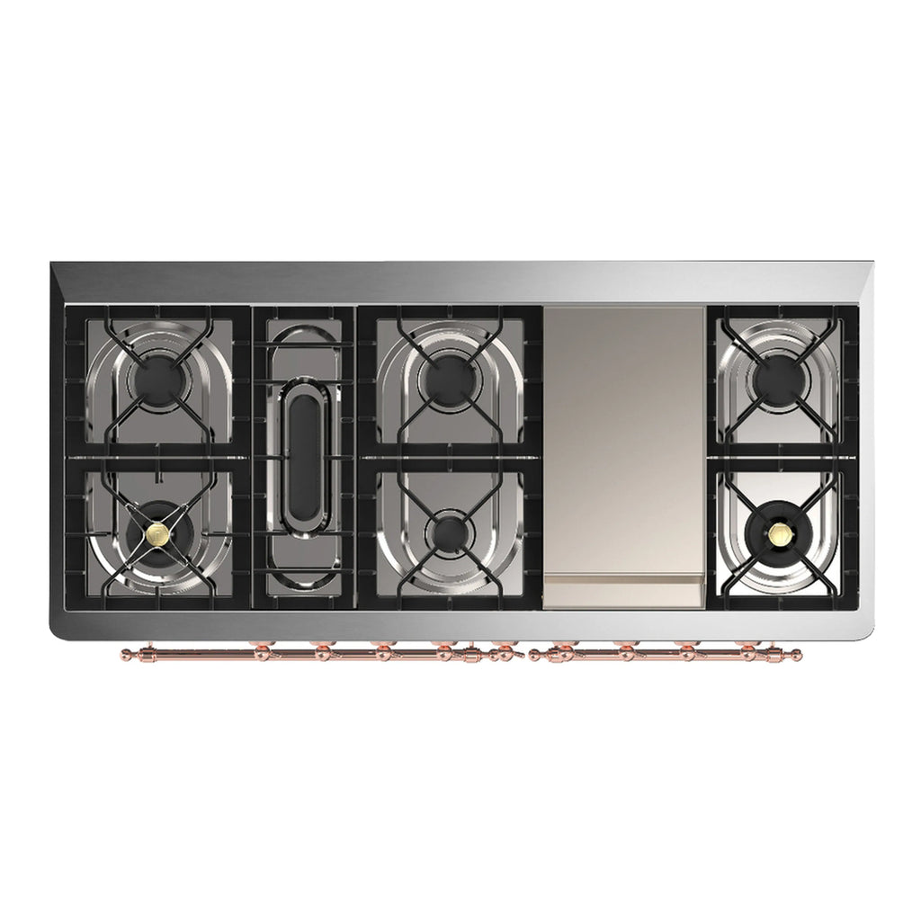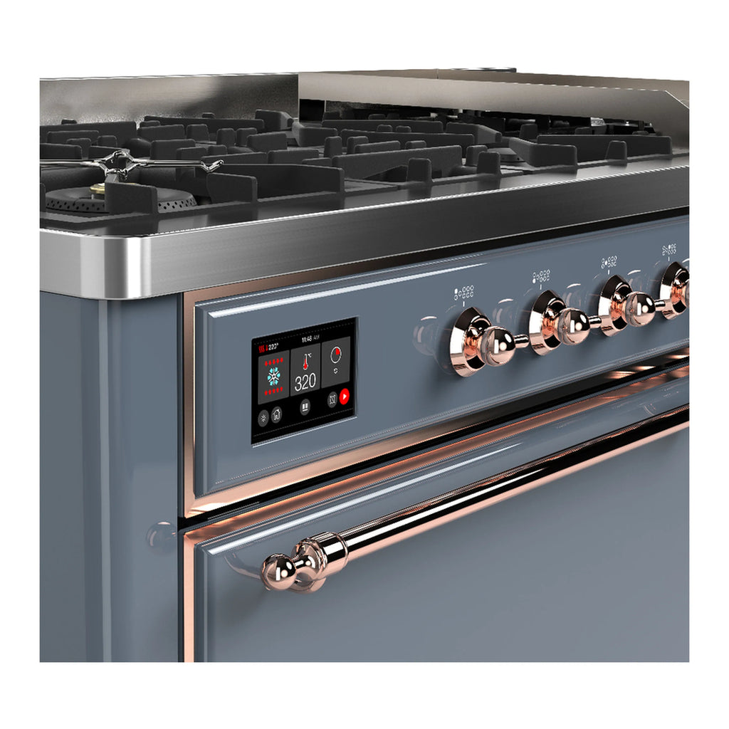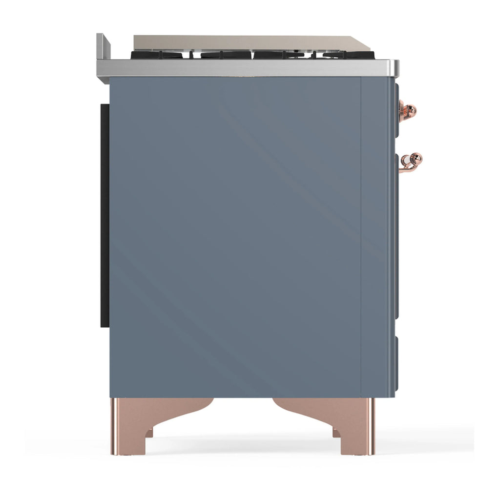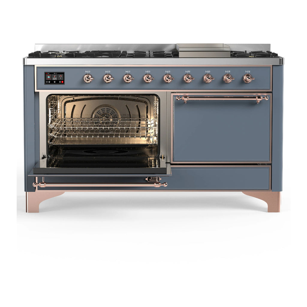 ILVE Majestic III 60-inch Dual Fuel Range with 5 Liquid Propane Burner, Griddle and Solid Door Electric Oven in Blue Grey with Copper Trim (UM60FQNR3BGPLP)