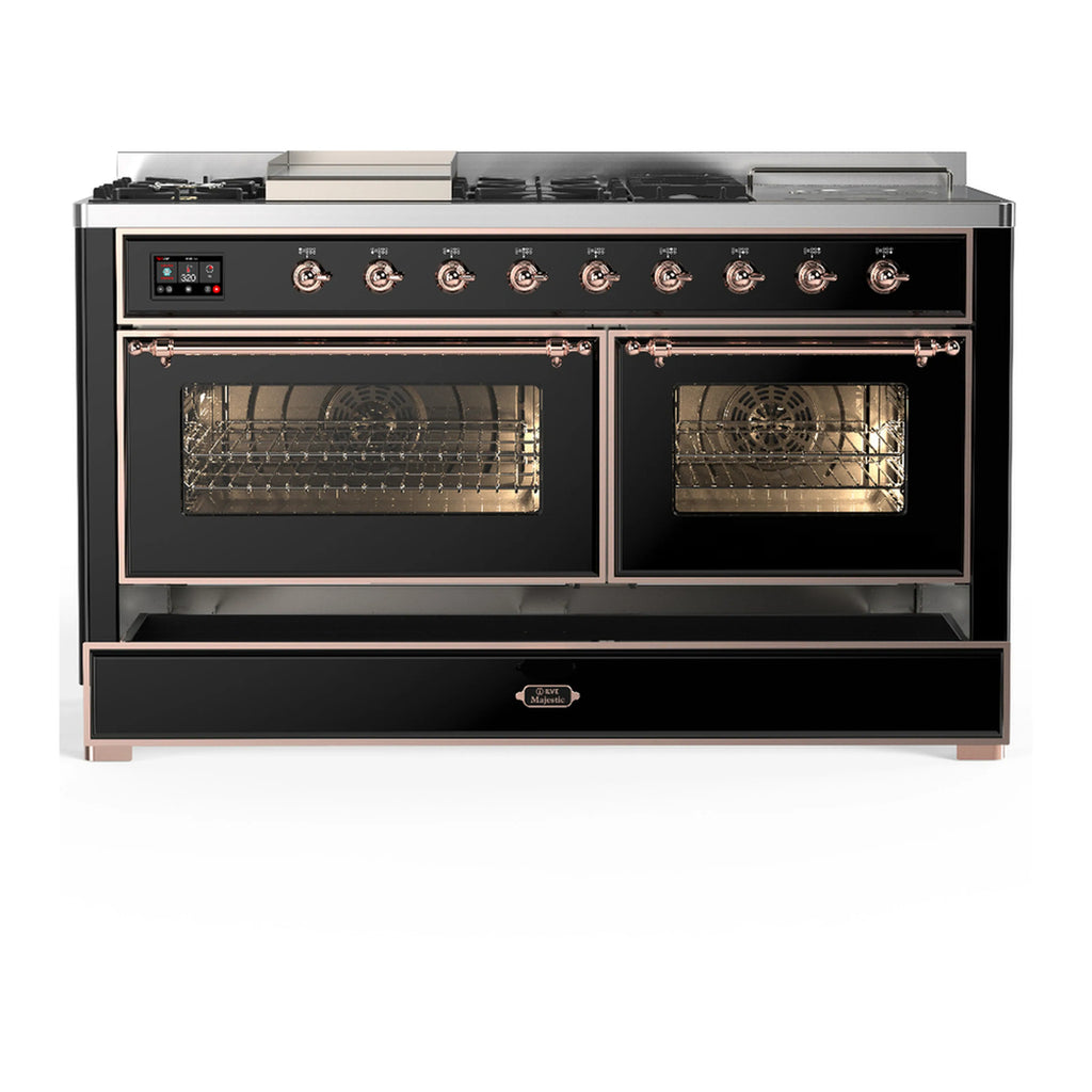 ILVE Majestic III 60-inch Dual Fuel Range with 5 Liquid Propane Burner, Griddle, French Top and Triple Glass Door Electric Oven in Glossy Black with Copper Trim (UM60FSNR3BKPLP)