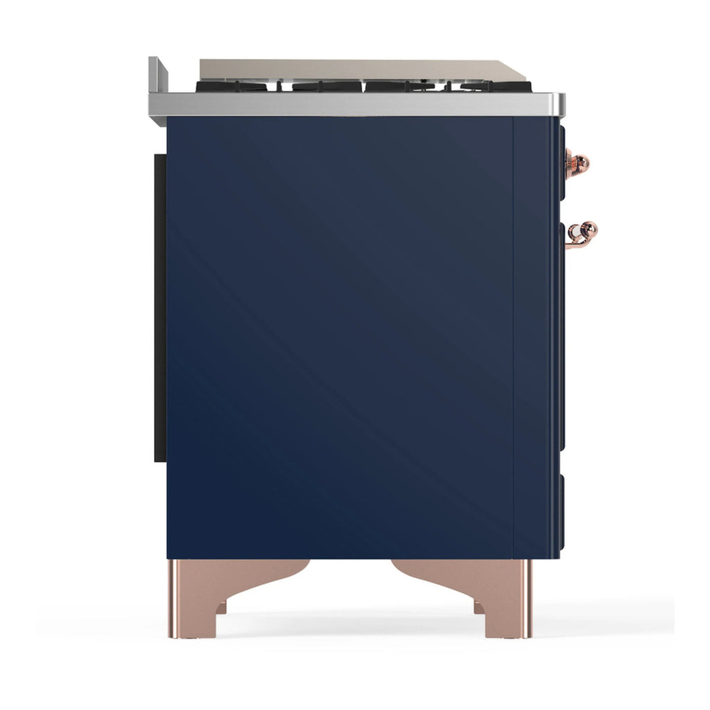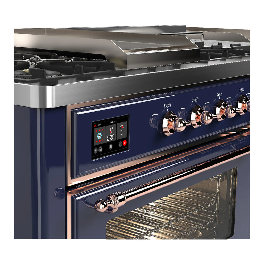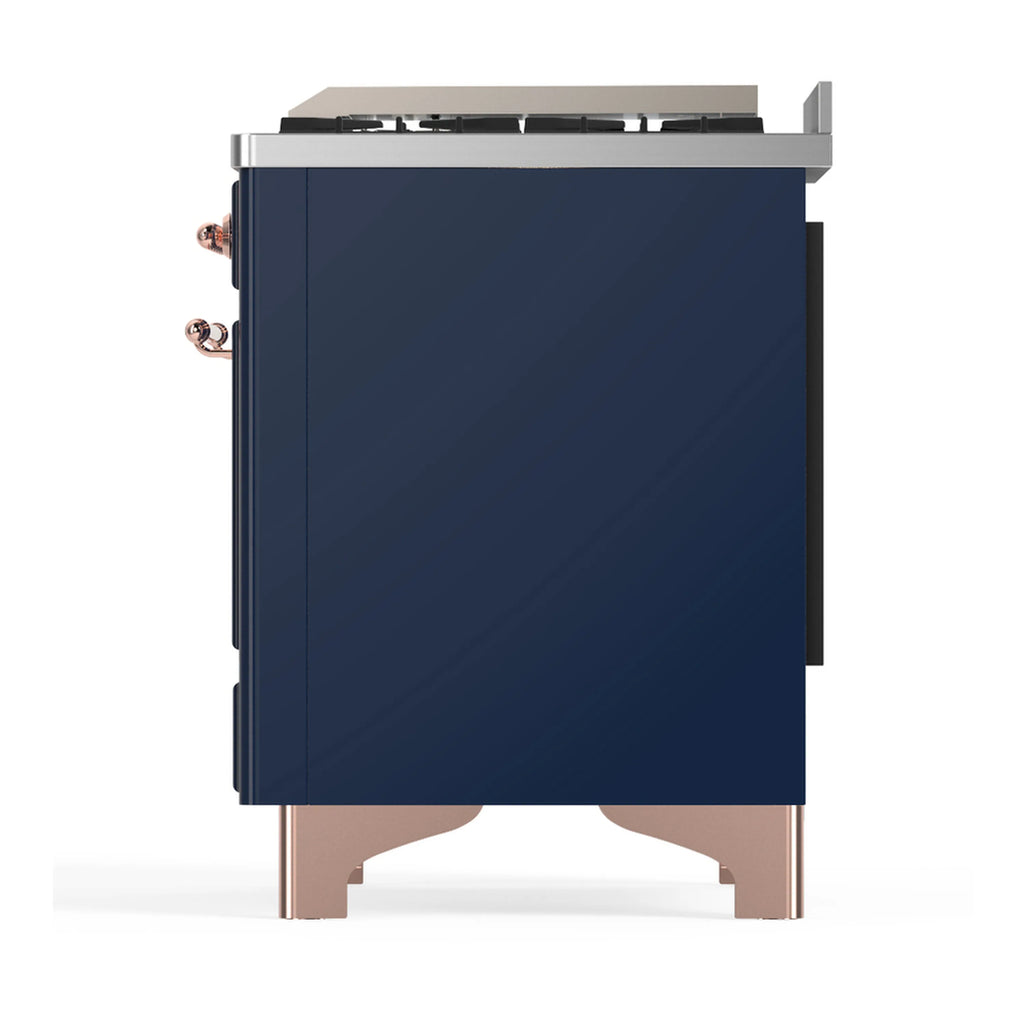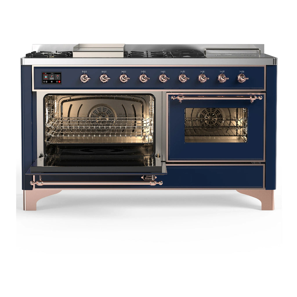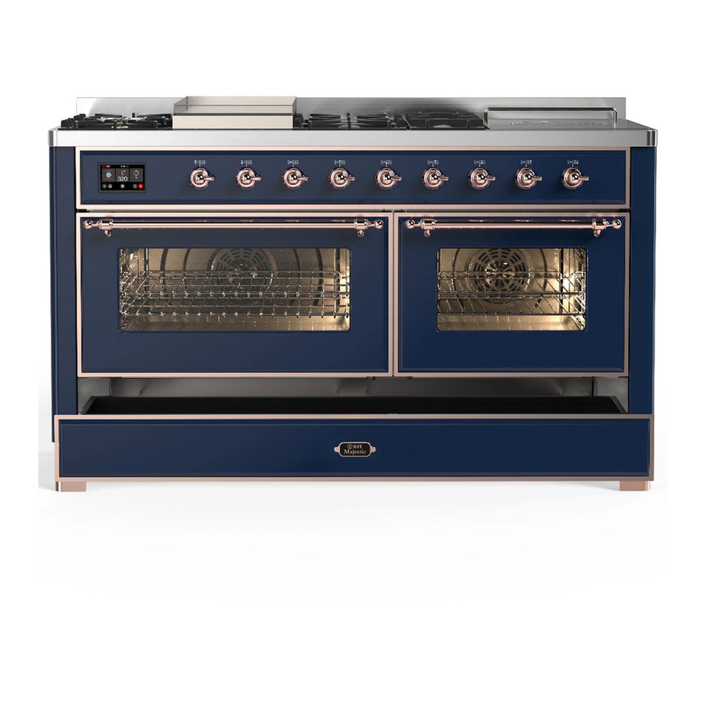 ILVE Majestic III 60-inch Dual Fuel Range with 5 Liquid Propane Burner, Griddle, French Top and Triple Glass Door Electric Oven in Midnight Blue with Copper Trim (UM60FSNR3MBPLP)