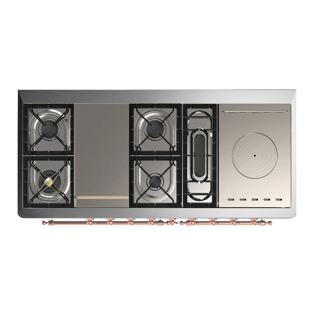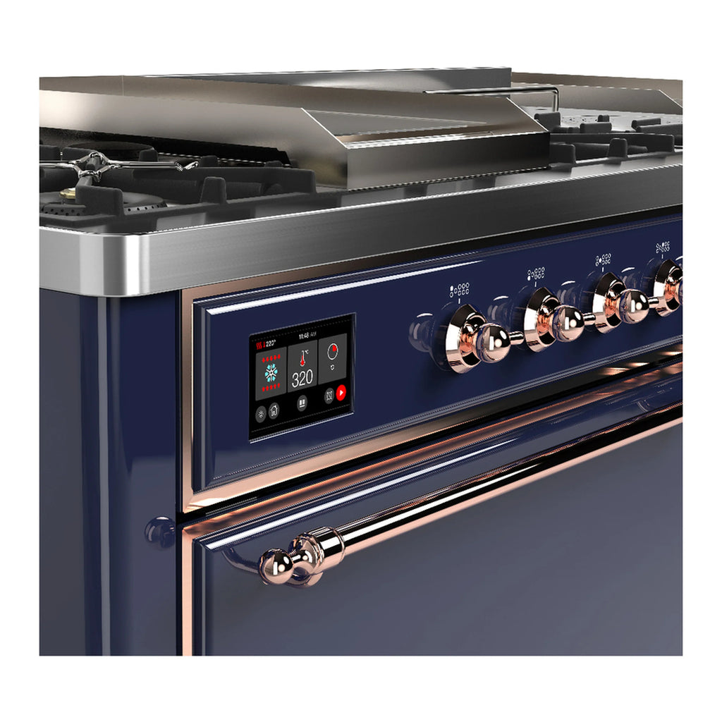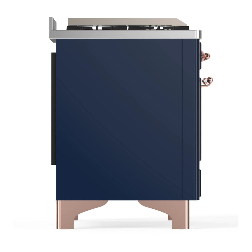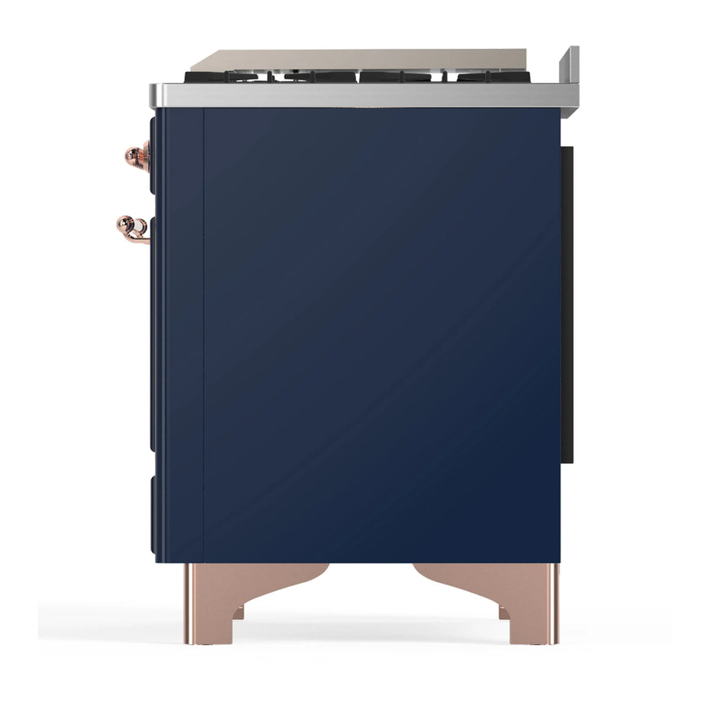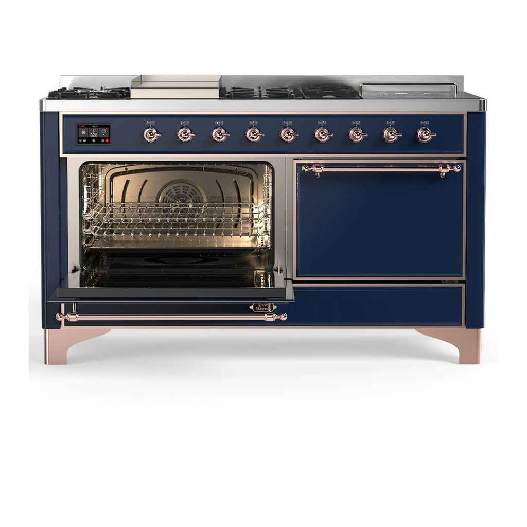 ILVE Majestic III 60-inch Dual Fuel Range with 5 Liquid Propane Burner, Griddle, French Top and Solid Door Electric Oven in Midnight Blue with Copper Trim (UM60FSQNR3MBPLP)