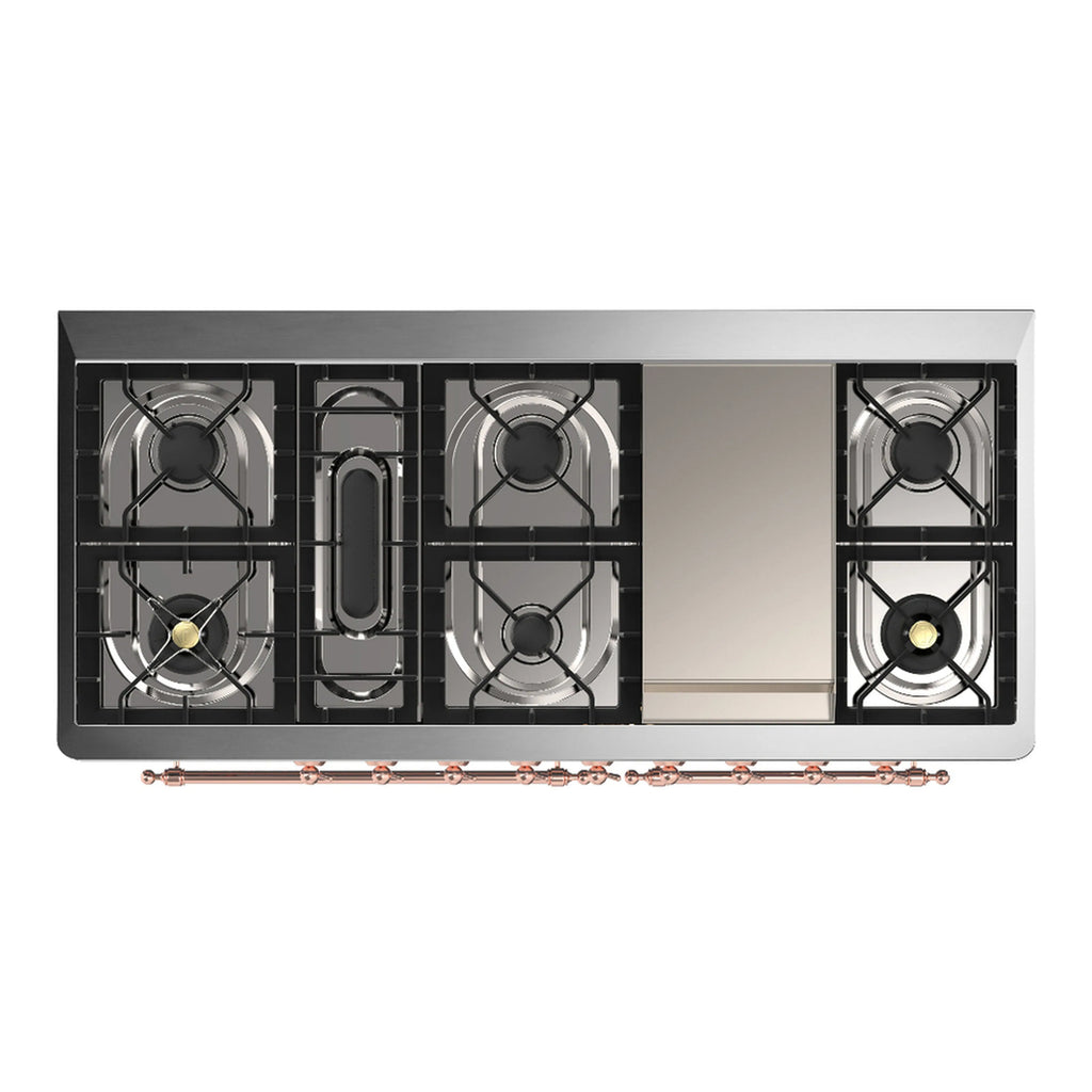 ILVE Majestic III 60-inch Dual Fuel Range with 7 Natural Gas Burner, Griddle and Solid Door Electric Oven in Stainless Steel with Copper Trim (UM60FQNR3SSP)