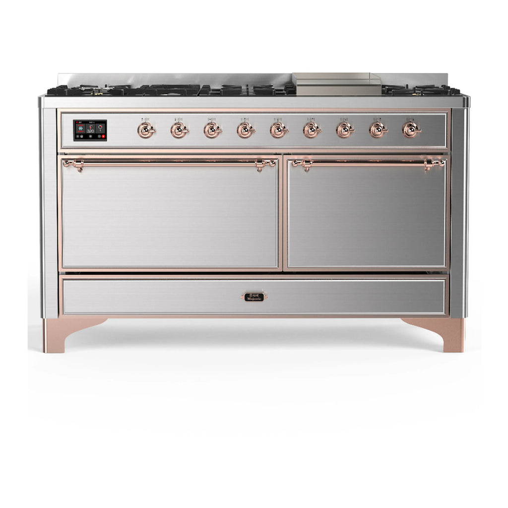 ILVE Majestic III 60-inch Dual Fuel Range with 5 Liquid Propane Burner, Griddle and Solid Door Electric Oven in Stainless Steel with Copper Trim (UM60FQNR3SSPLP)